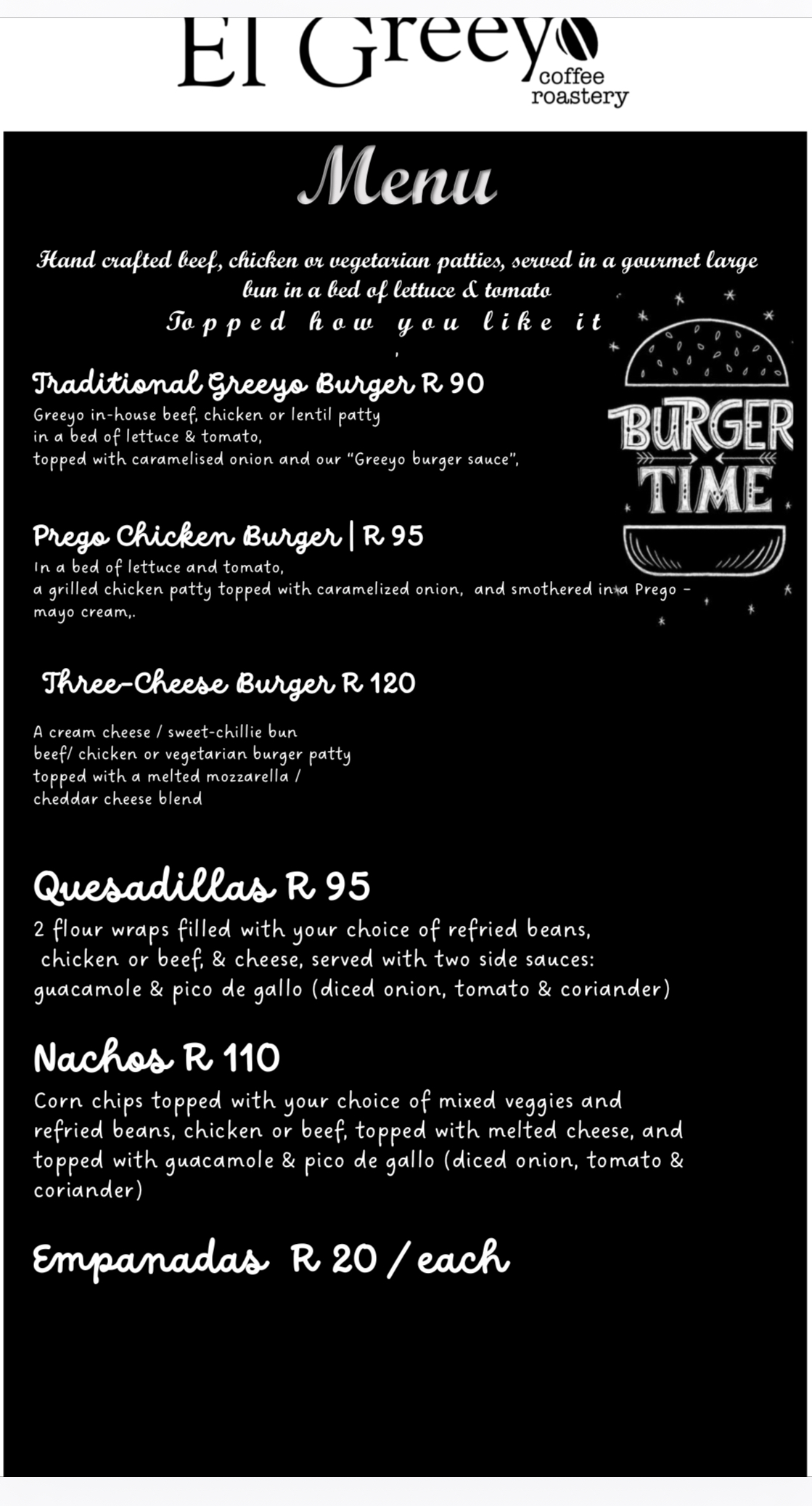 - Food: quesadillas, nachos, empanadas, burgers