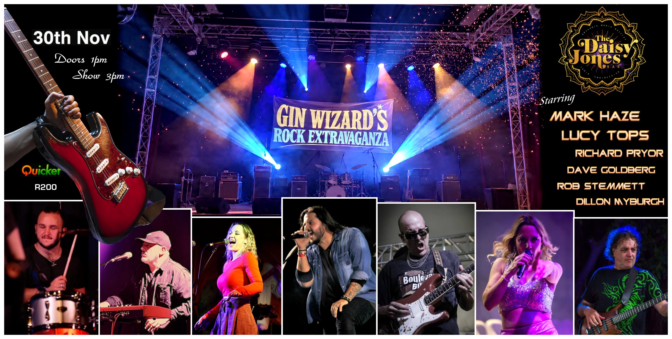 On Sun 30th Nov Gin Wizard's ROCK EXTRAVAGANZA explodes onto The Daisy Jones Stage with a Show that is going to Rock your world. At one of the best Live music venues in SA, two of SA's most Powerful Singers MARK HAZE & LUCY TOPS come together for the first time to deliver a fantastic Rock Show featuring Epic Songs from the 70s and a few tracks from the 60s and 80s. Expect ZZ Top, Dusty Springfield, Led Zeppelin, Queen, The Trammps, Journey, Jefferson Airplane, Doobie Brothers, Joe Cocker, Janis Joplin, The Beatles, Deep Purple, Chuck Berry, Muddy Waters, Guns & Roses, Elvis Presley and so much more