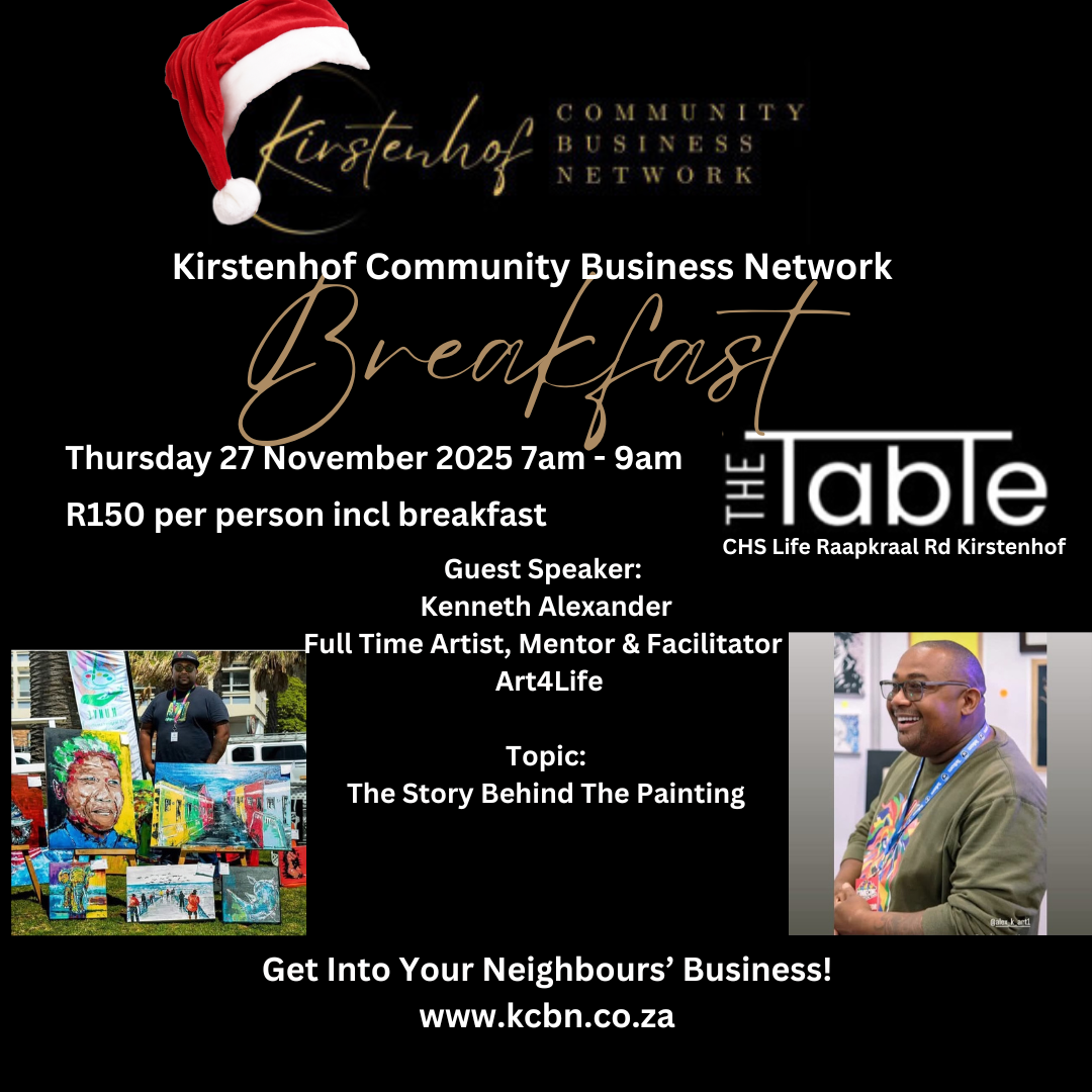 Join us for this month's Kirstenhof Community Business Network Breakfast at The Table - CHS Life Centre on Thursday 27 November 2025 - 7am - 9am.