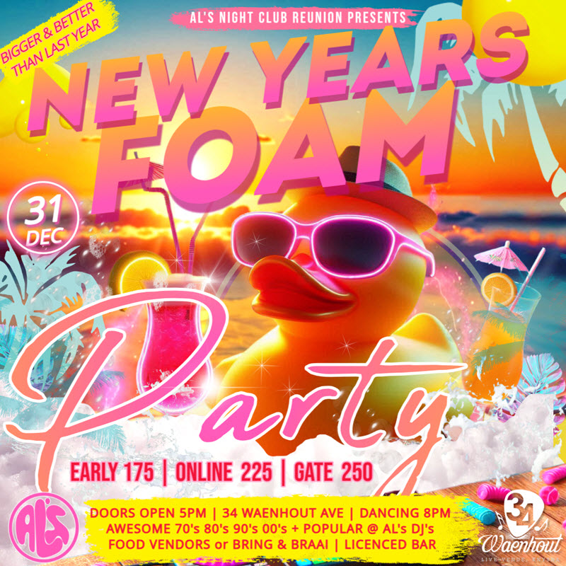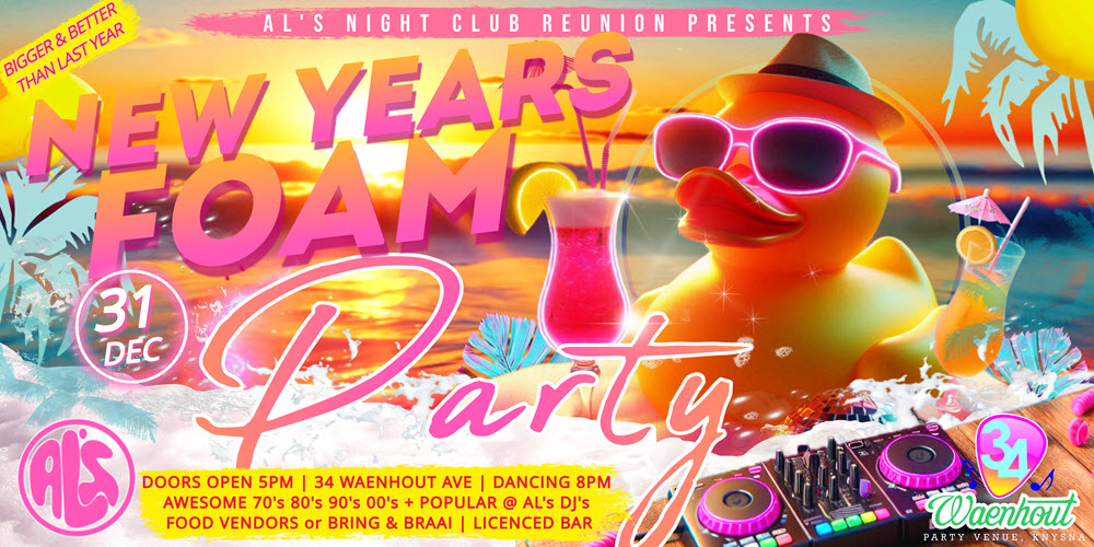 • We are double billing with AL’s NightClub – Reunion again - the same AWESOME DJ’s from Knysna’s Legendary AL’s NightClub, and yes no slipping into Techno later … as well as our Resident DJ “Nukes” after Midnight and YOU GUYS! – with even more 70’s 80's 90's, Naughties and All the popular Songs we love played all Night, Ice Chilled Drinks, Shooters, Bubbly and Cocktails from back then too plus Delicous Pizza and Build your Burger and lots of other Food all night too.