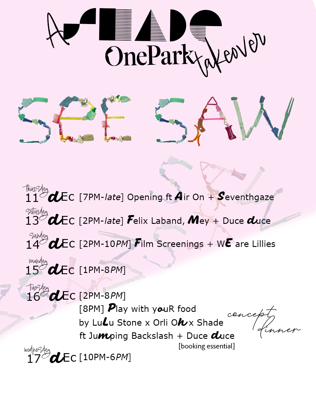 See Saw is a retrospective celebration of performances, artworks and art-in-works from Shade’s network of artists and dreamers. Drawing from its extensive archive, films and collections, Shade presents playful encounters throughout One Park for a week.