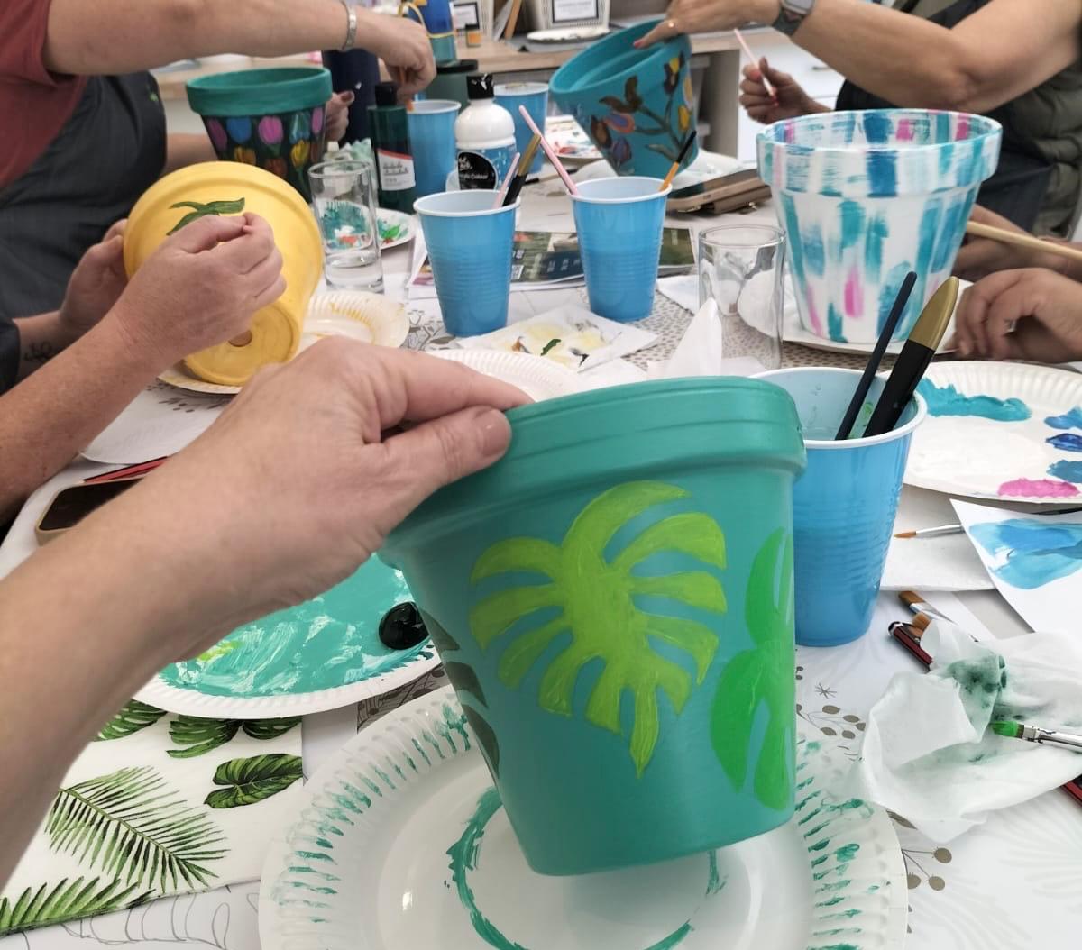 A relaxed and colourful painting session where everyone decorates their own terracotta pot.