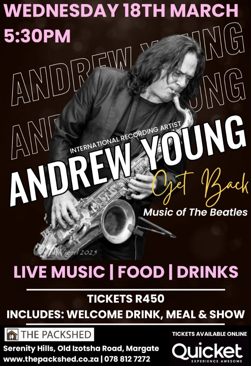TICKETS: R450 - this includes: Welcome Drink, Meal & 1 night performance by Andrew Young