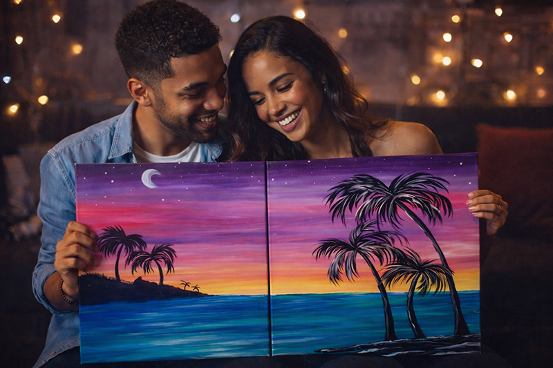 Instead of dinner-and-a-movie, you and your favourite person will sit side-by-side, sip something delicious, and create one shared masterpiece across two canvases. Two canvases. Two people. One work of art that only comes together when you do.