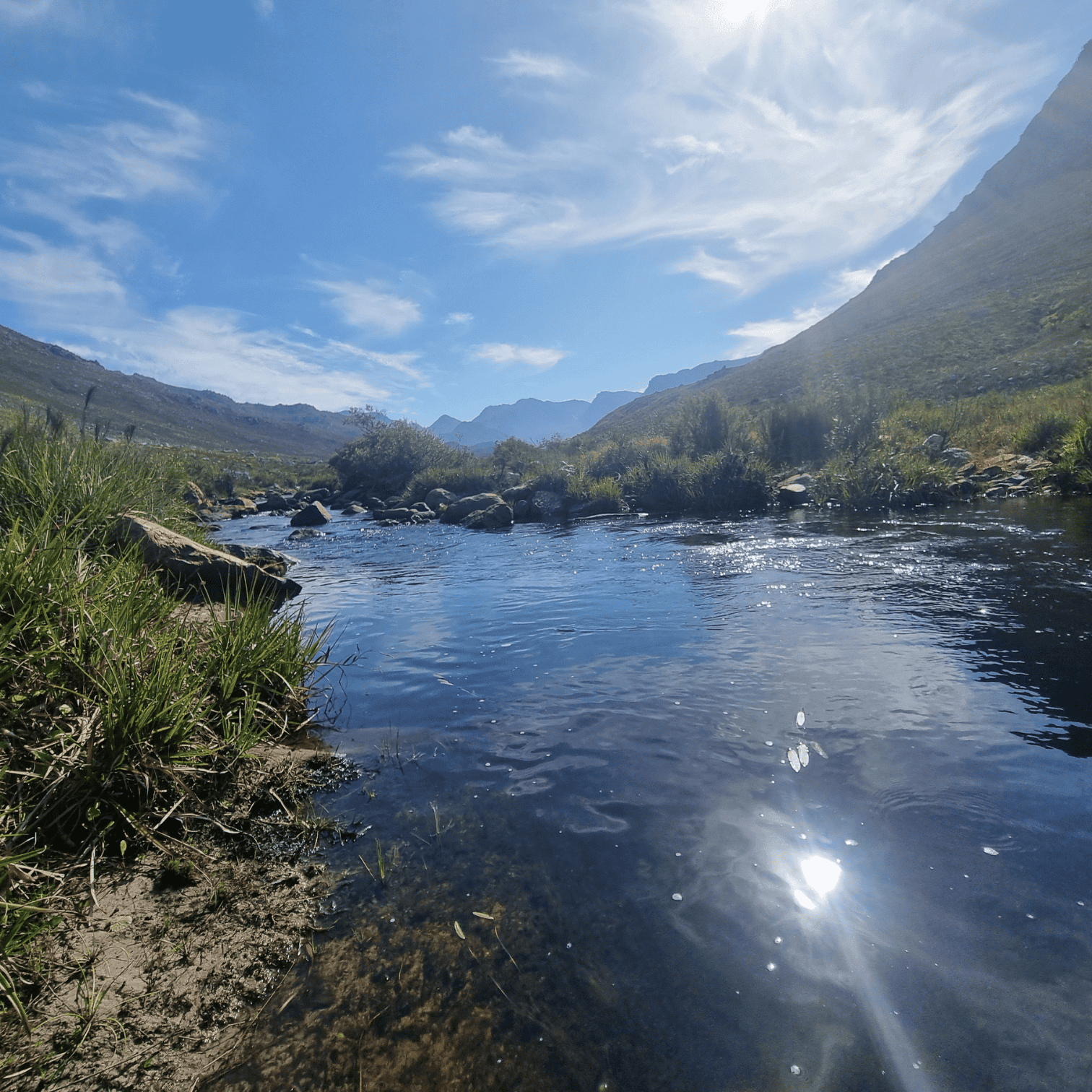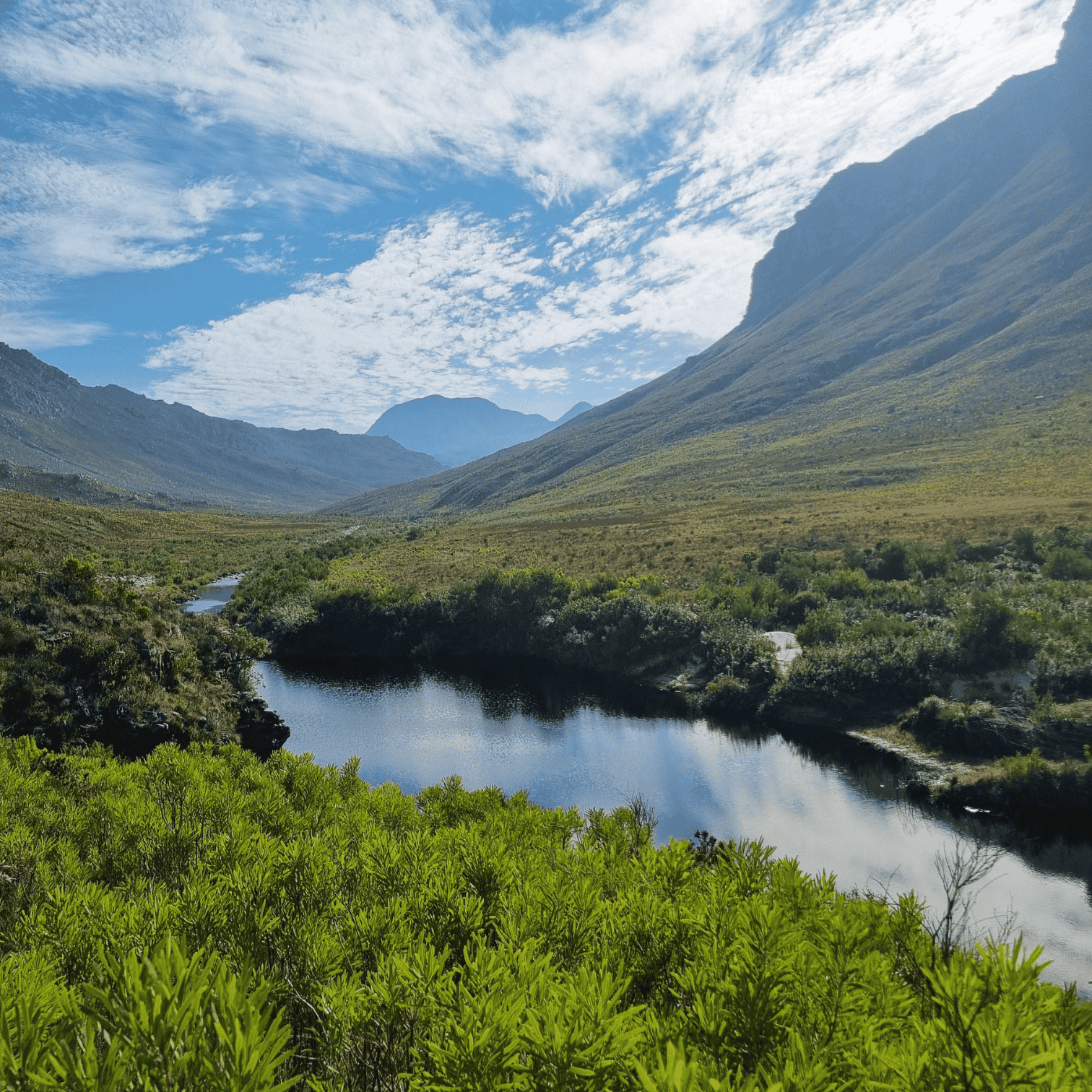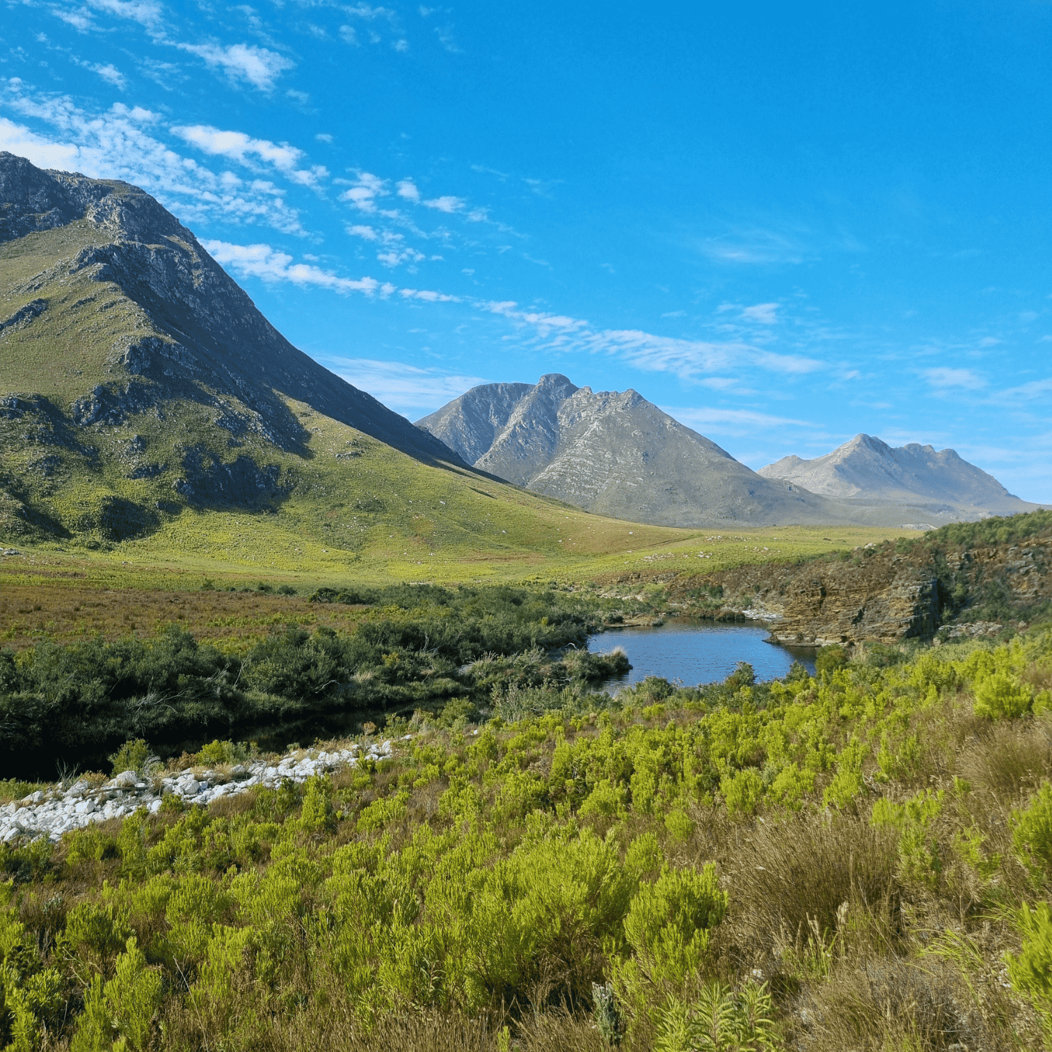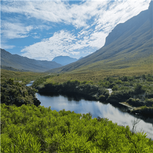 Along the way, you’ll be surrounded by towering proteas and vibrant fynbos, with the majestic Kogelberg Mountains framing the route. About 4 km in, you’ll arrive at "The Beach," a secluded white-sand spot beside a deep, refreshing pool—perfect for a tea break and a swim, weather permitting.