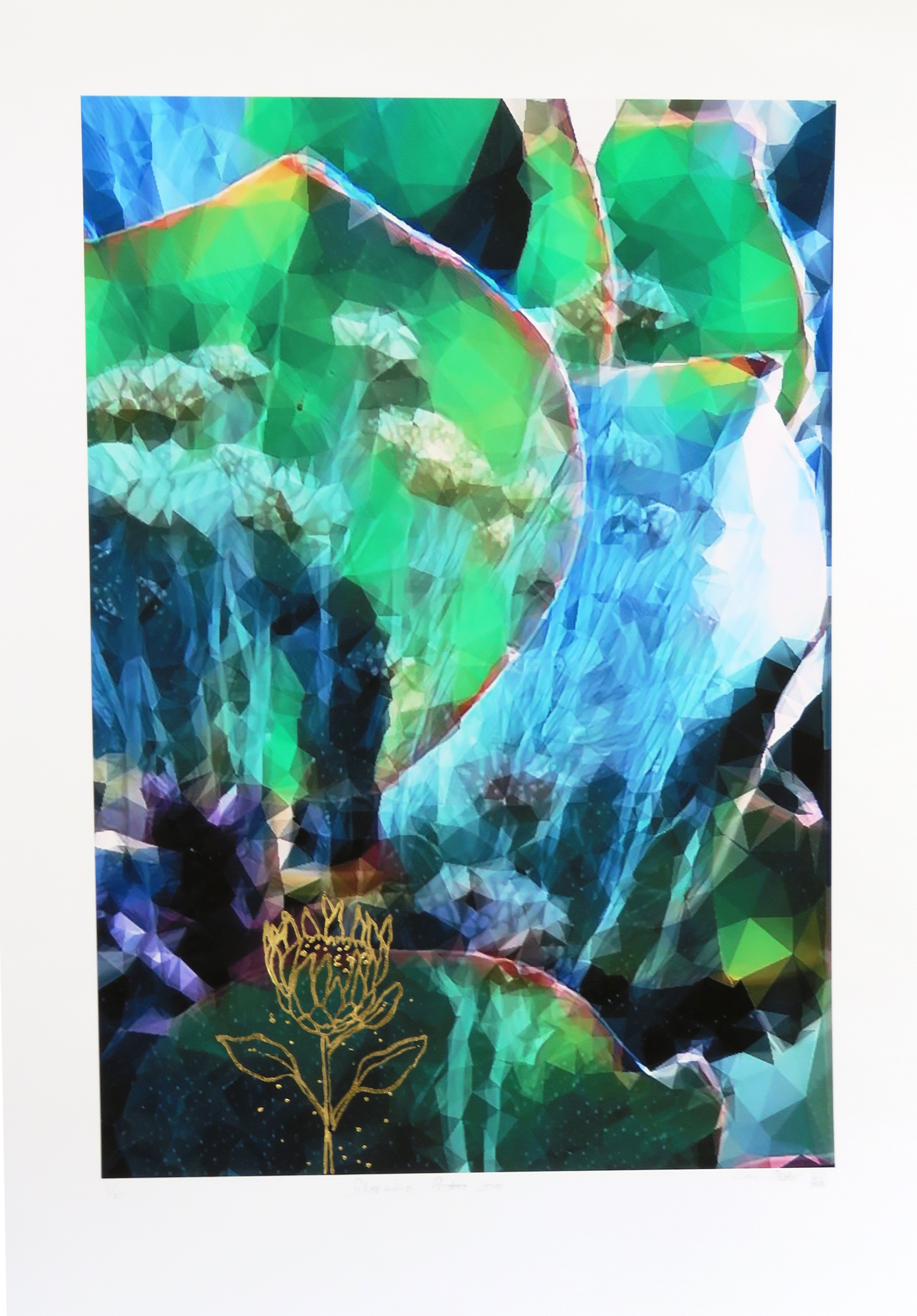Kim’s love of art, design, photography and nature has inspired the development of this print which is a new addition to Kim’s “Cosmic Collection”, a collection of works focusing on re-creating nature into cosmic eco-systems. Regular walks through various areas of the Table Mountain Nature Reserve have provided Kim with the images she needs to develop her artistry in various mediums.