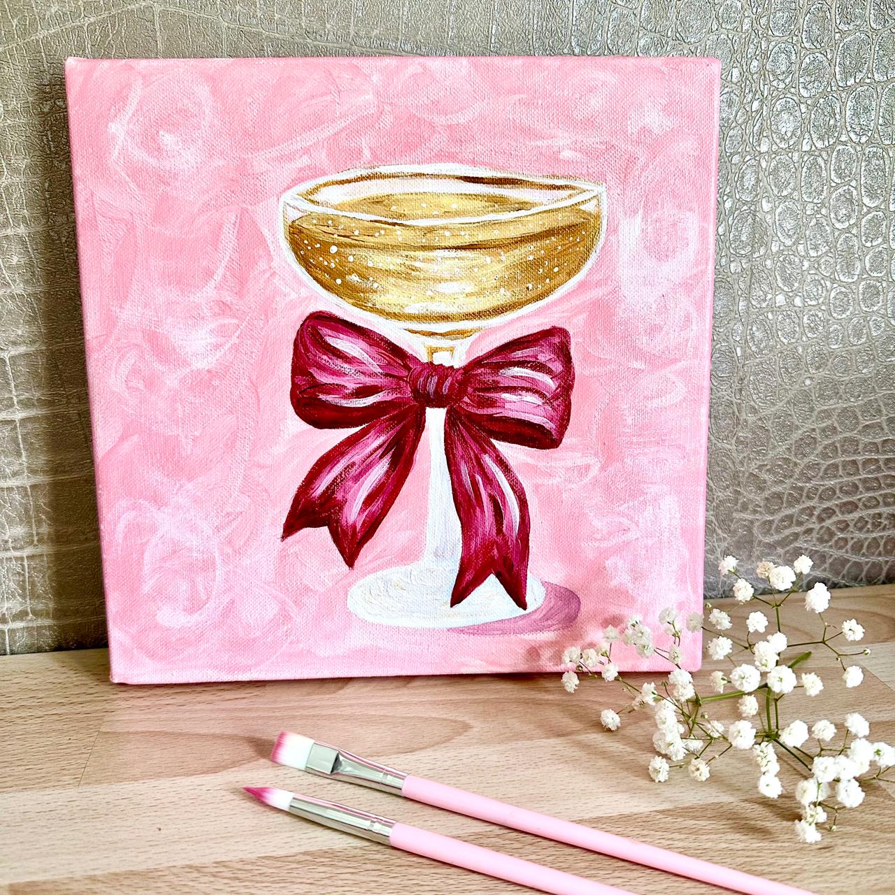 In this guided Paint & Sip experience, you’ll create a beautiful 30x30cm artwork featuring a romantic champagne coupe adorned with a statement bow — soft blush hues, subtle gold accents and just the right touch of glam.