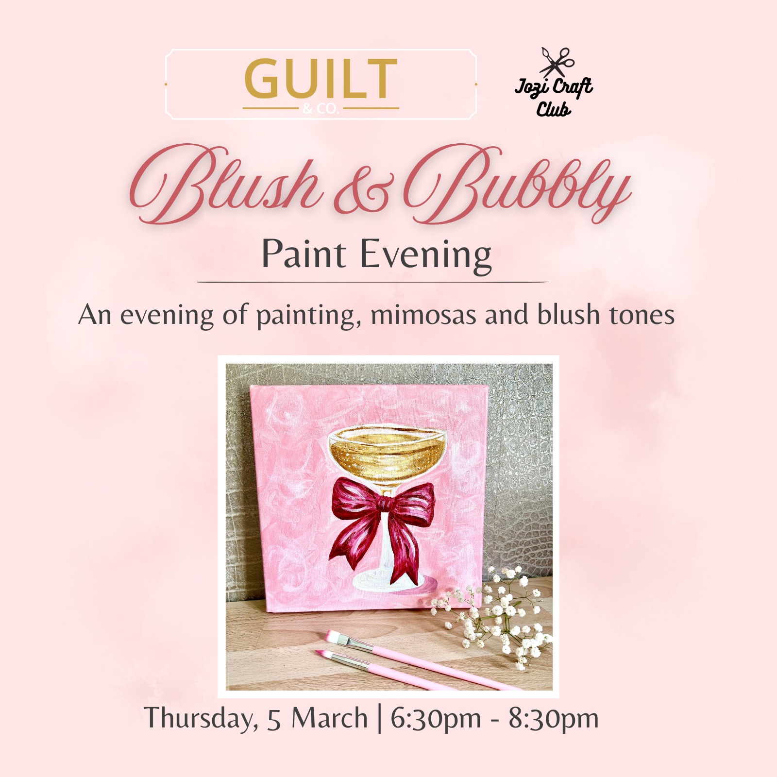 Join us for an elegant evening of painting, Mimosa's and pink tones at Guilt & Co.