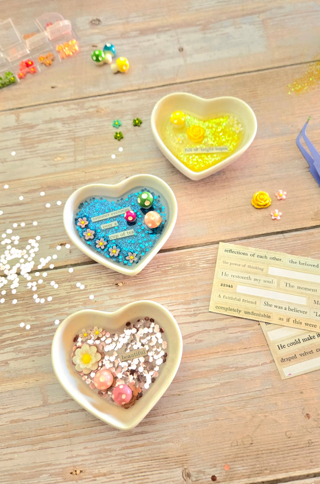 You’ll decorate the inside of a beautiful dish using a curated selection of pressed flowers, beads, pearls, shells, papers, tiny treasures and words etc. Once your design is complete, we’ll seal it with the final layers of UV resin, giving it a smooth, glossy finish that locks everything in beautifully.
