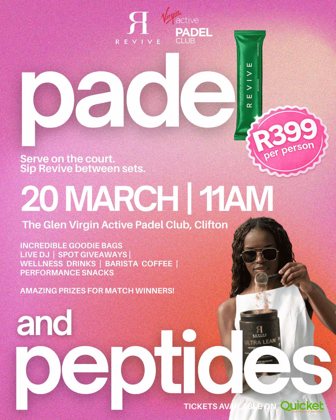 Join Revive Lab South Africa at The Glen Virgin Active Padel Club in Clifton for a girls padel day set against the Clifton Beach backdrop.
