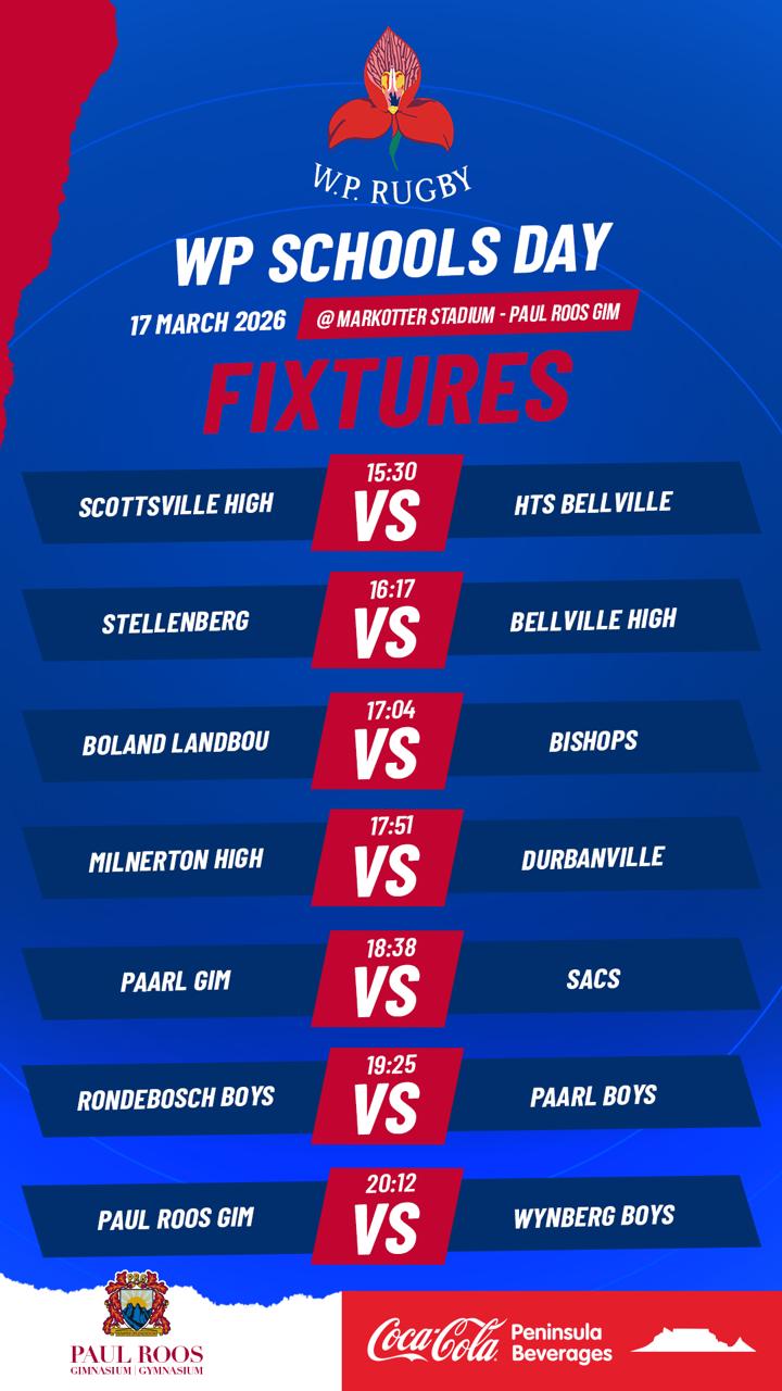 Western Province Rugby Football Union proudly presents the annual WP Schools Day 2026, an exciting afternoon of schoolboy rugby hosted at Markötter Stadium at Paul Roos Gymnasium on 17 March 2026.