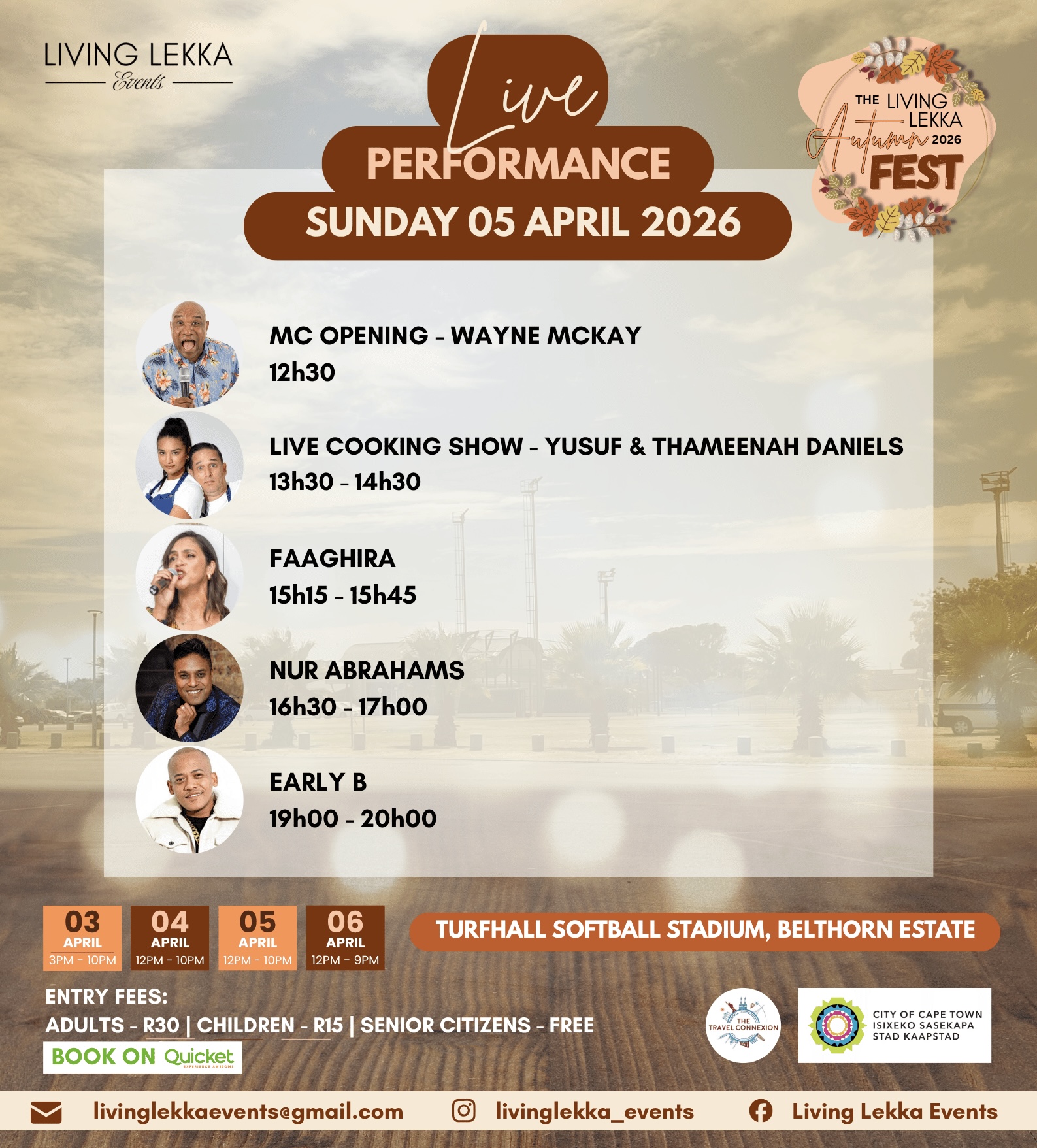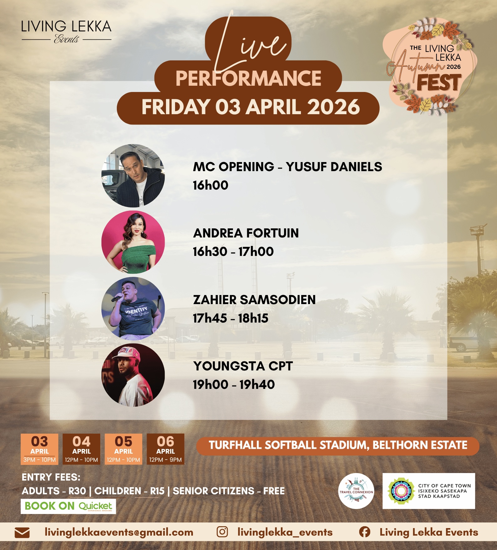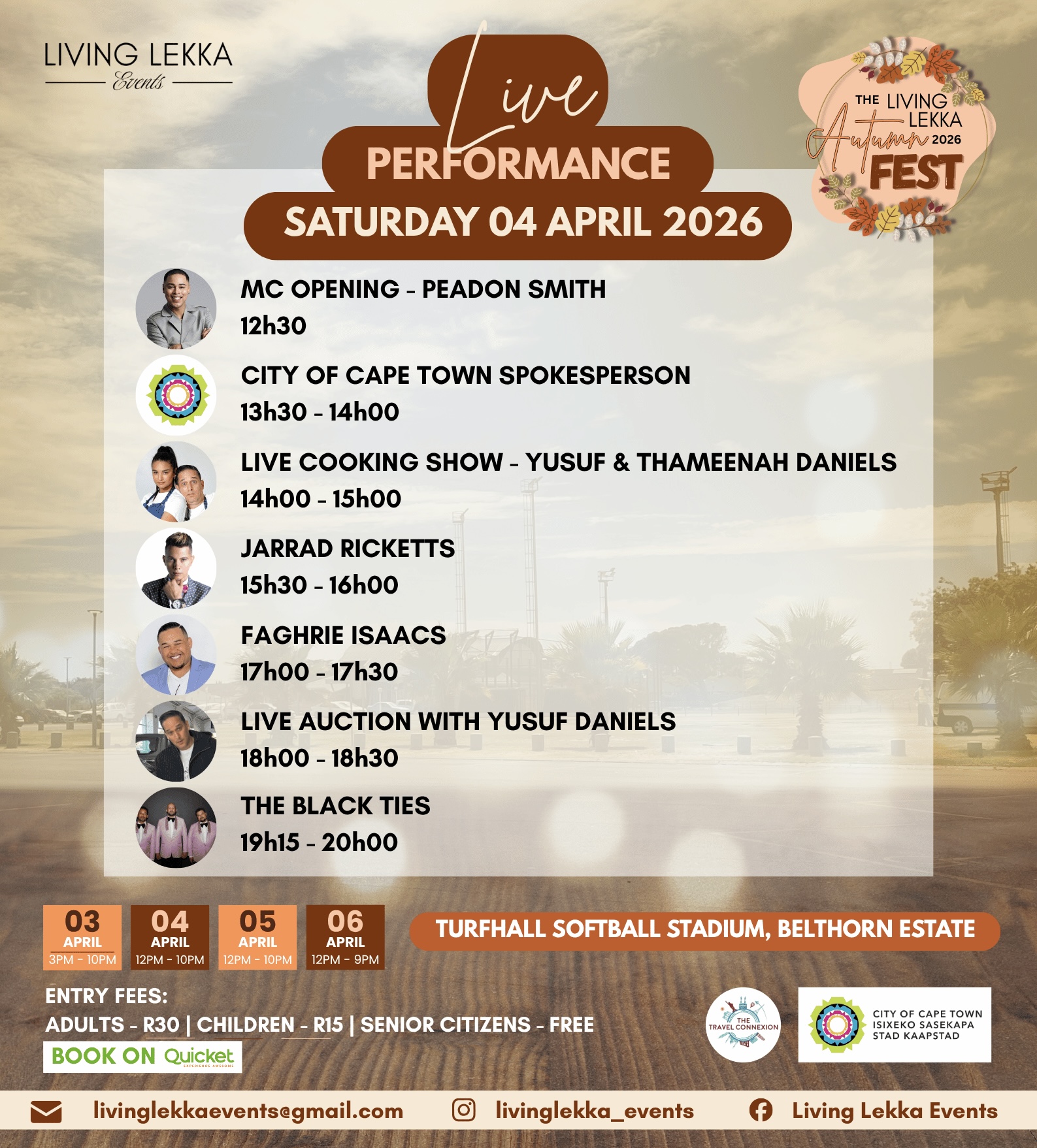 Check out the full programme lineup on the Living Lekka Events social pages (Facebook, Instagram & TikTok).
