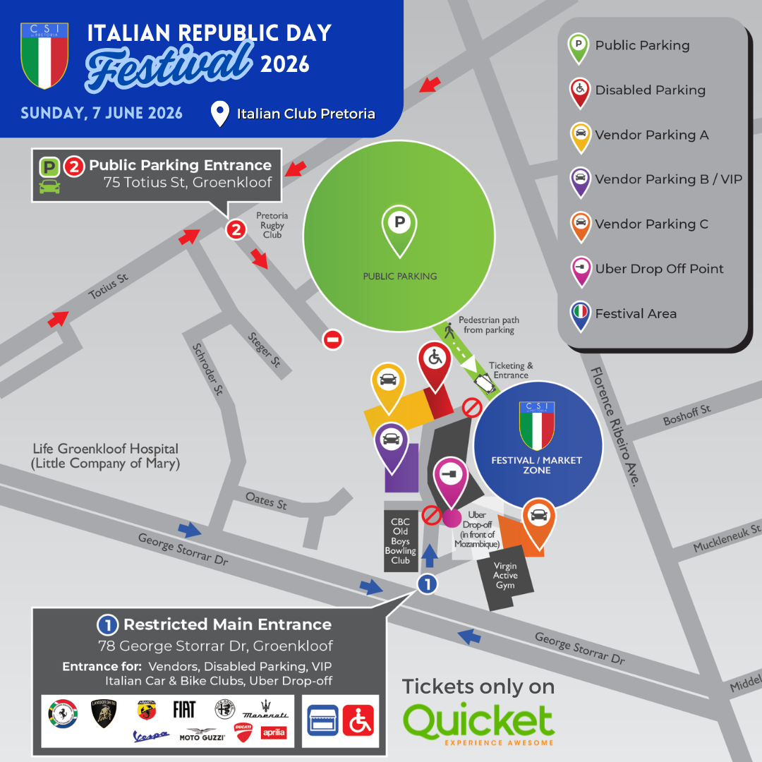 • Public parking available at: 75 Totius St, Groenkloof, Pretoria – R30 per vehicle.