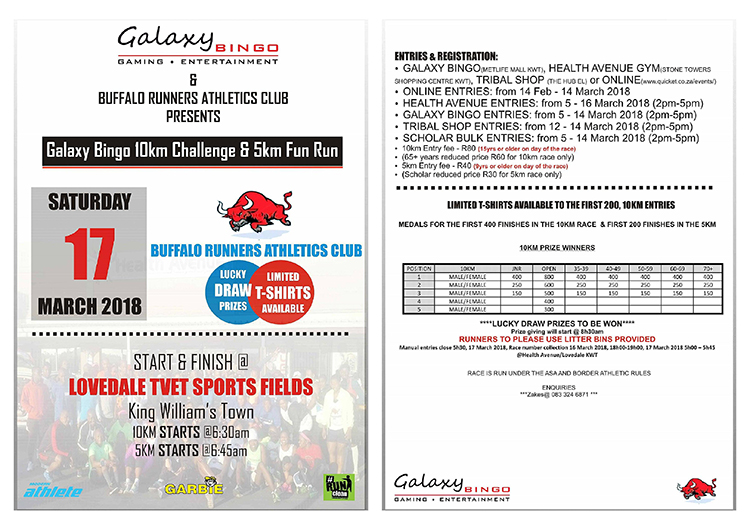 Buffalo Runners Athletics Club is hosting Galaxy Bingo 10km Challenge and Fun Run at Lovedale TVT College Kingwilliamstown on the 17 March 2018 starting 6:30am for 10km and 6:45am for the 5km fun run. Prize giving ceremony will take place directly after the race at 8:30am.