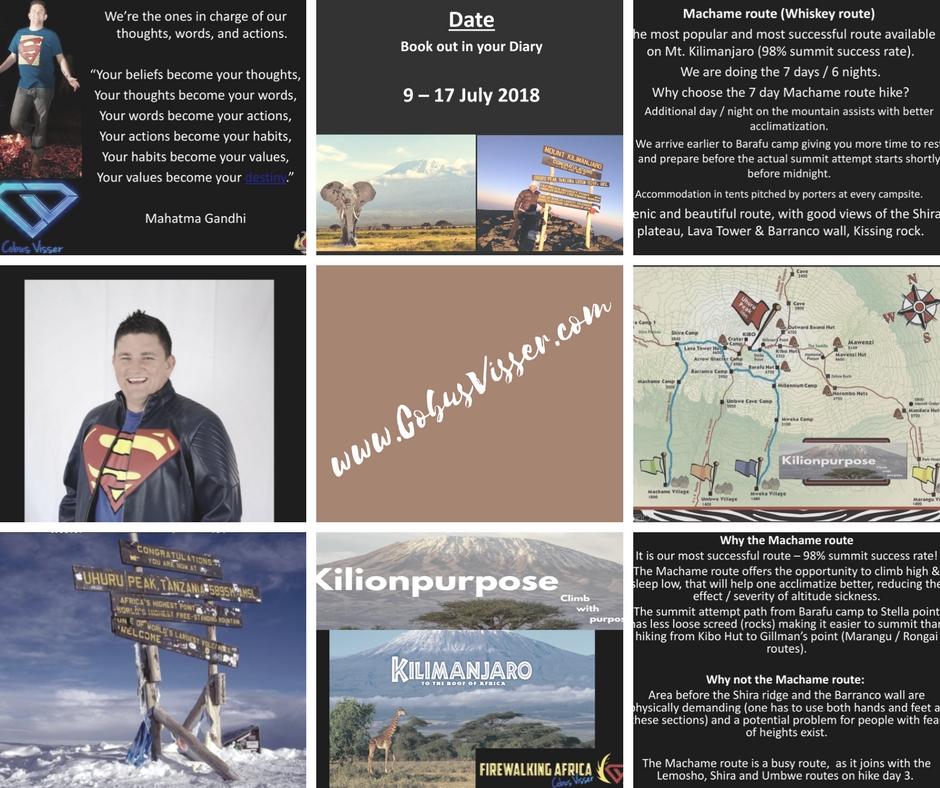 6-Incl Ticket 5+company logo on Flag planted on Kili+in Book + Teambuild for your Team1-30persons(Firewalk or Glasswalk or Arrowbreak) *T&C (only when finished after climbing kilimnajaro up to max of 12months waiting, Coaching will be arranged to suite both parties time schedule and platform like Zoom or Skype, If in Gauteng in meeting person can be arranged in Centurion, Also for Motivational Talk/Teambuild only In Gauteng area, other countries or provinces in South africa is to cover Travel,food,accomodation and teambuild equipment cost, Logo to be provided to use on flag to be planted at Kilimanjaro and to be placed in book)