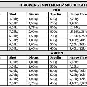 THROWING IMPLEMENT SPECS