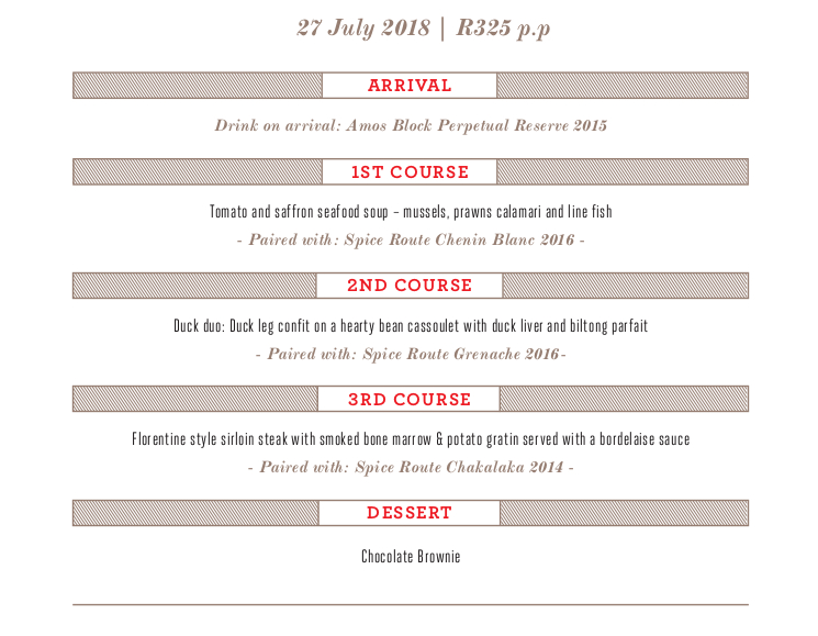 Join Spice Route Wines Winemaker, Charl Du Plessis, and Barley & Biltong Emporium's Chef, Philip Pretorius, for a wonderful evening of great quality wine & delicious food pairing!