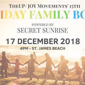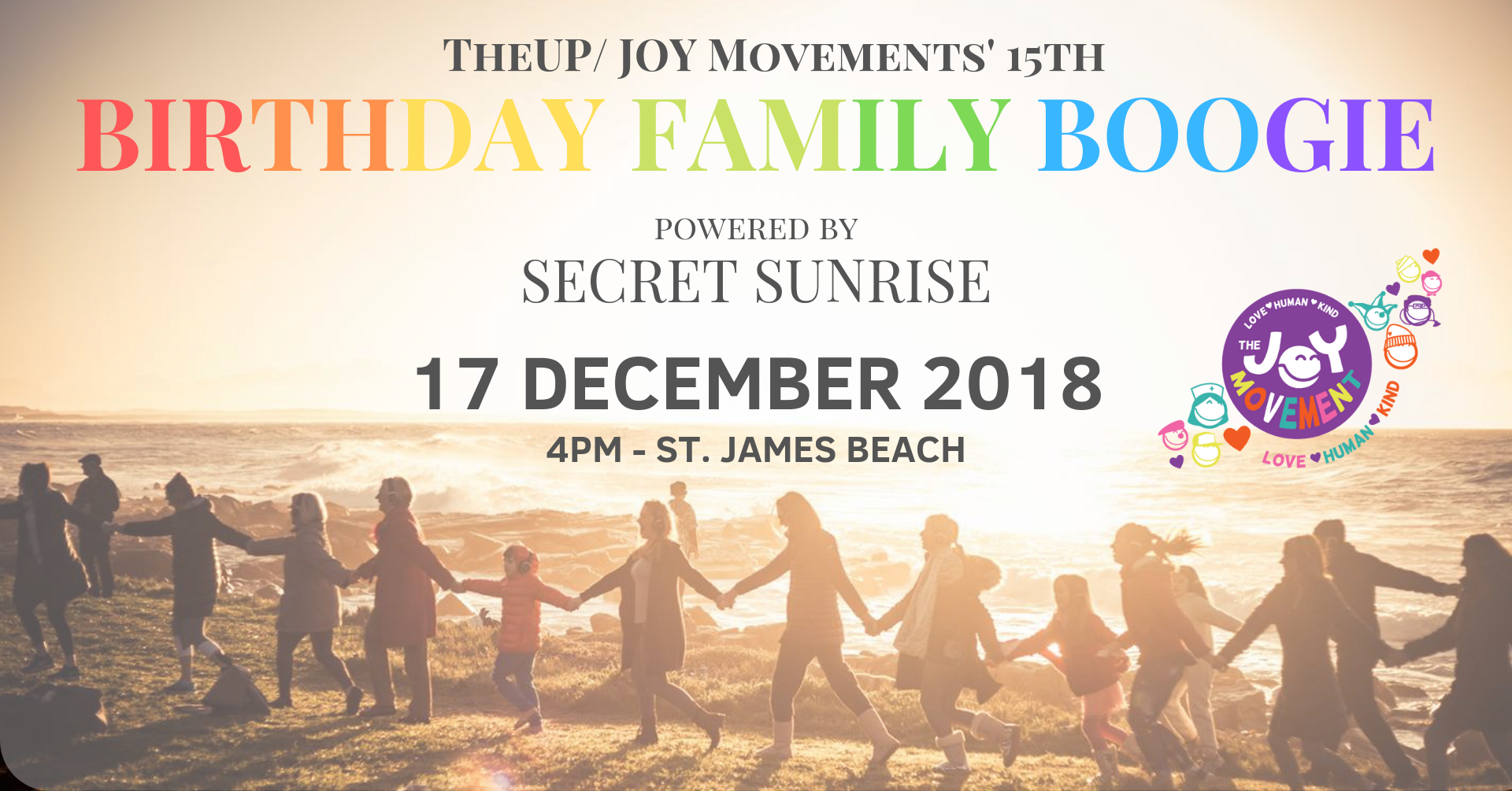 15th BIRTHDAY FAMILY BOOGIE - 17th December 4-5pm St James Beach - R100pp (or all access pass) FUNdraiser for the Joy Movement - (powered by Secret Sunrise)... Bring your whole family and enjoy a fun dance experience together!