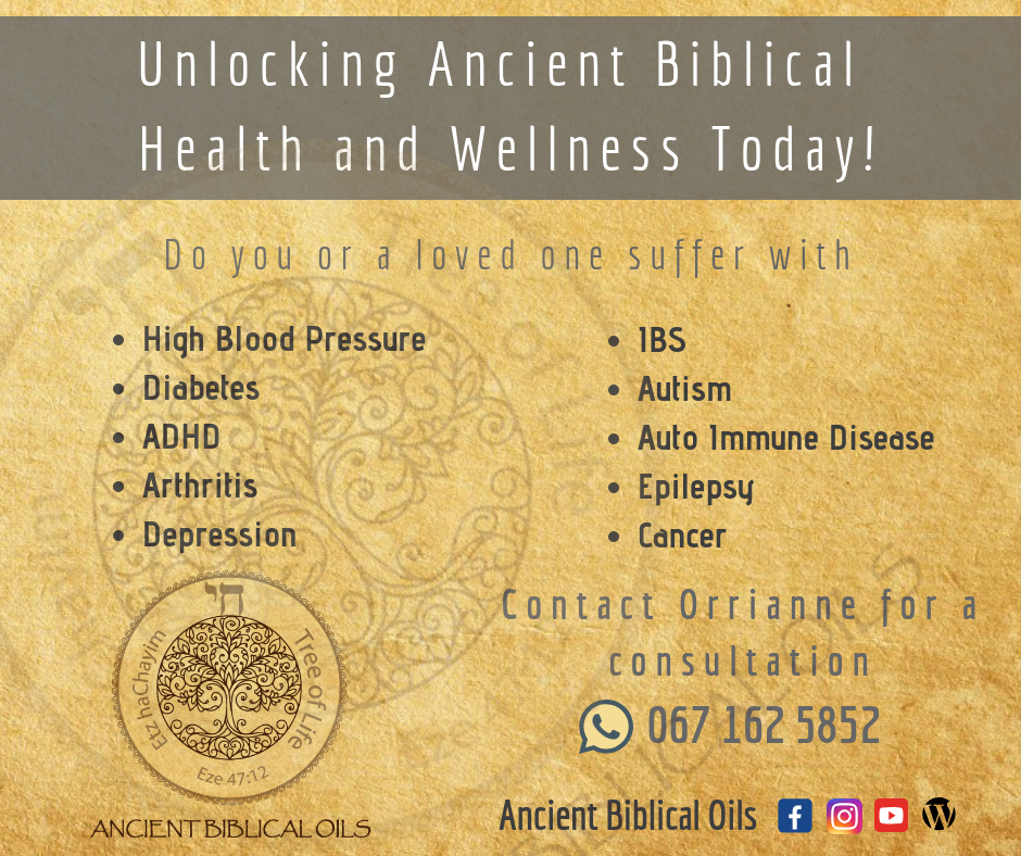 Note: Authentic Ancient Biblical health and wellness products like Frankincense and Myrrh resins, balms etc will be available for purchase.