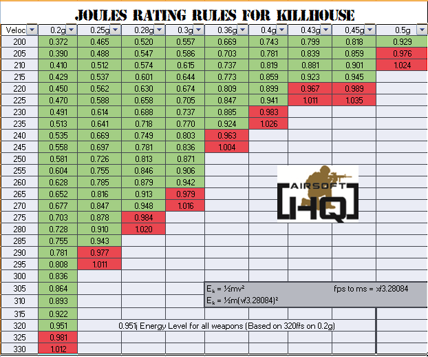 | Below is a table that maps energy (joules) to FPS (feet per second) for a 0.2g BB. Note that all energy numbers in joules on our site are based on speeds of firing a 0.2g BB. Obviously, use of a heavier BB will increase the MASS parameter and result in lower FPS as per the formula above. |