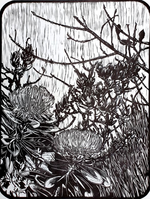 It’s in this space of beauty and scarcity, where three Cape artists comment on the climate’s impact on our world. Each brings their unique approach and experience to an exhibition inspired by issues on their hearts: Fynbos, drought, rain and buckets.