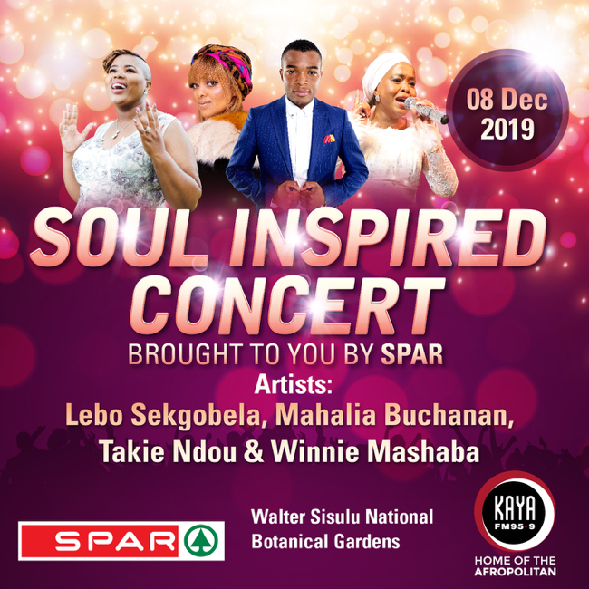 Get ready for a soul-shaking, inspiring and uplifting musical feast. Kaya FM 95.9 presents the Soul Inspired Concert brought to you by SPAR. The concert will feature some of the premiere names in the soul and gospel world. Winnie Mashaba, Takie Ndou, Lebo Sekgobela and Mahalia Buchanan will take the stage on 8 December at the Walter Sisulu Botanical Gardens, Poortview, west of Johannesburg. This much anticipated event will hit all the right notes for soul and gospel music fans in Gauteng as we usher in the festive season in style.