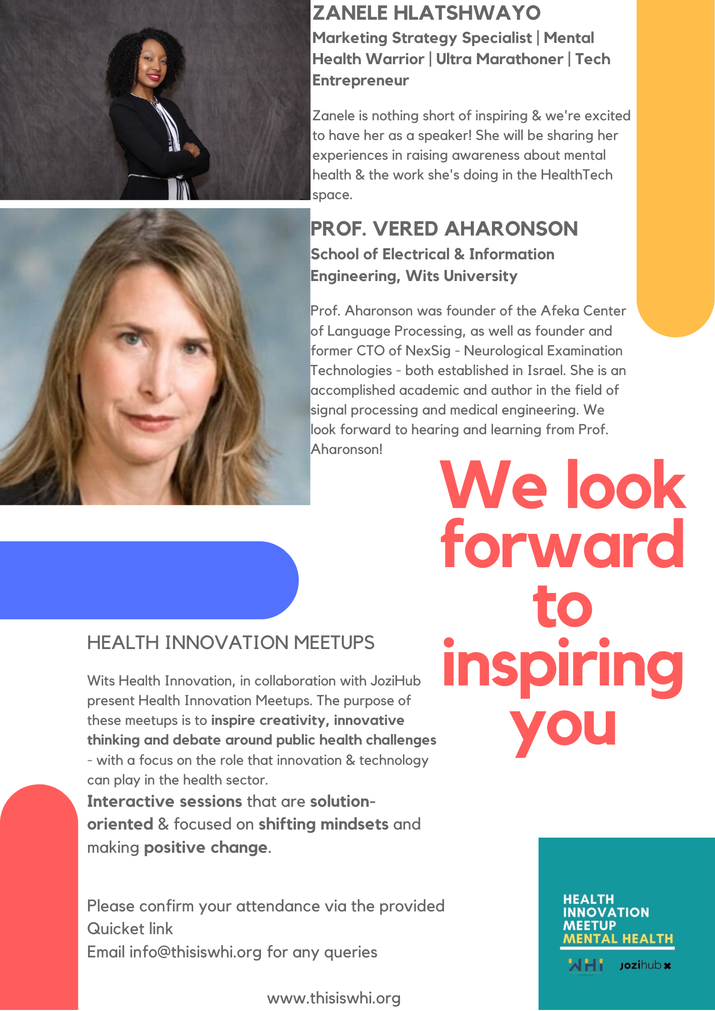 Our very first meetup is focused on the role of innovation and technology in mental health care. We are excited to introduce Zanele Hlatshwayo (founder of #Rise18) and Prof. Vered Aharonson (associate professor at the School of Electrical and Information Engineering and founder of ACLP and NexSig) as our guest speakers for the event. Please find more detailed bios below.