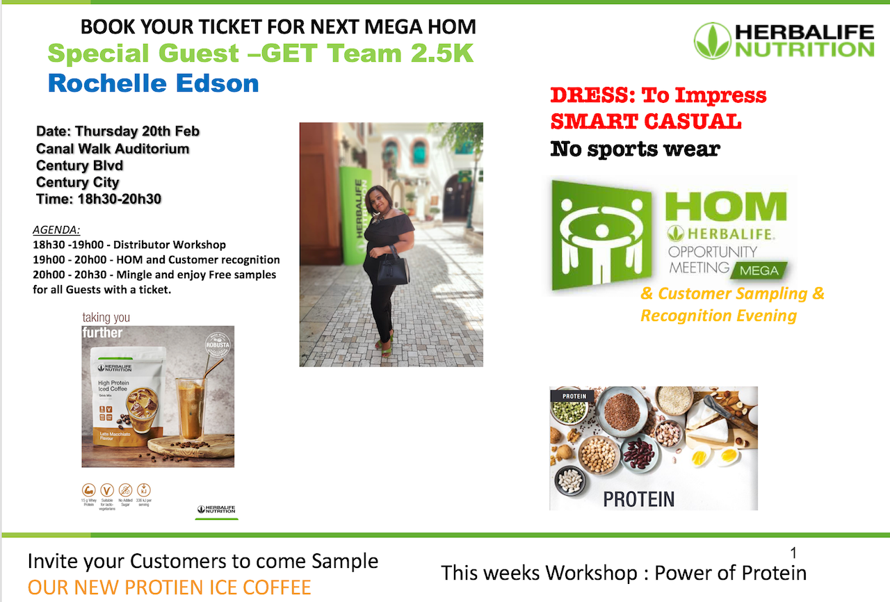 19h00 - 20h00 - Herbalife Opportunity Meeting and Customer recognition- Open to Guests and Distributors