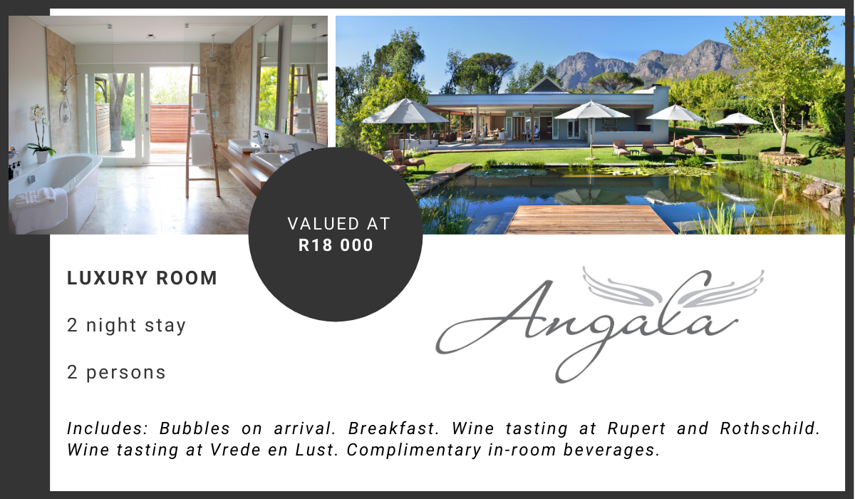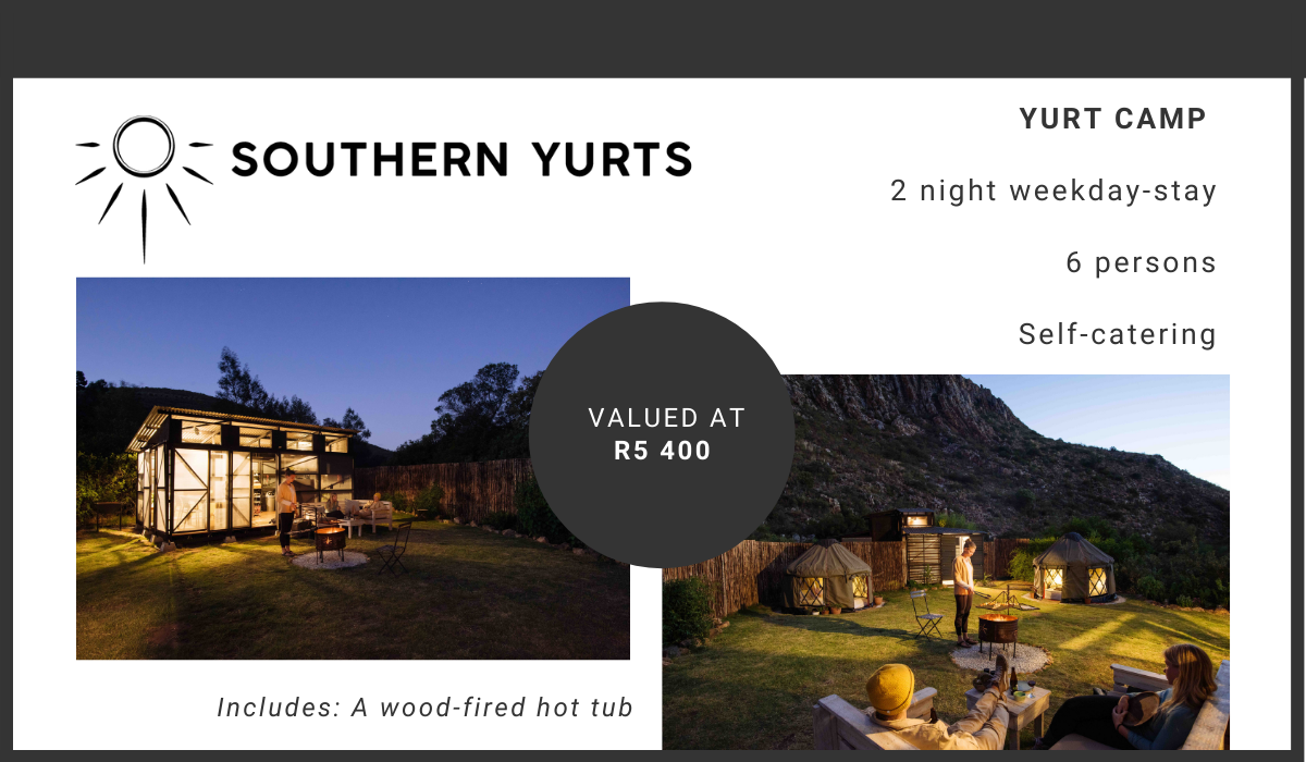 - Donations that go up in increments of R150 will be counted as additional entries (ie. A R150 donation enters a person into all remaining getaway giveaways; A R300 donation then doubles their chances, etc)