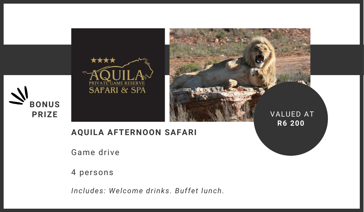 Aquila Game Reserve's most popular half day safari. Join us midday for a delicious South African style lunch, and a 2 to3 hour Big 5 Safari. The safari is led by an experienced guide who will share exciting inside stories and facts about your surroundings, easily rousing your inner wild side.