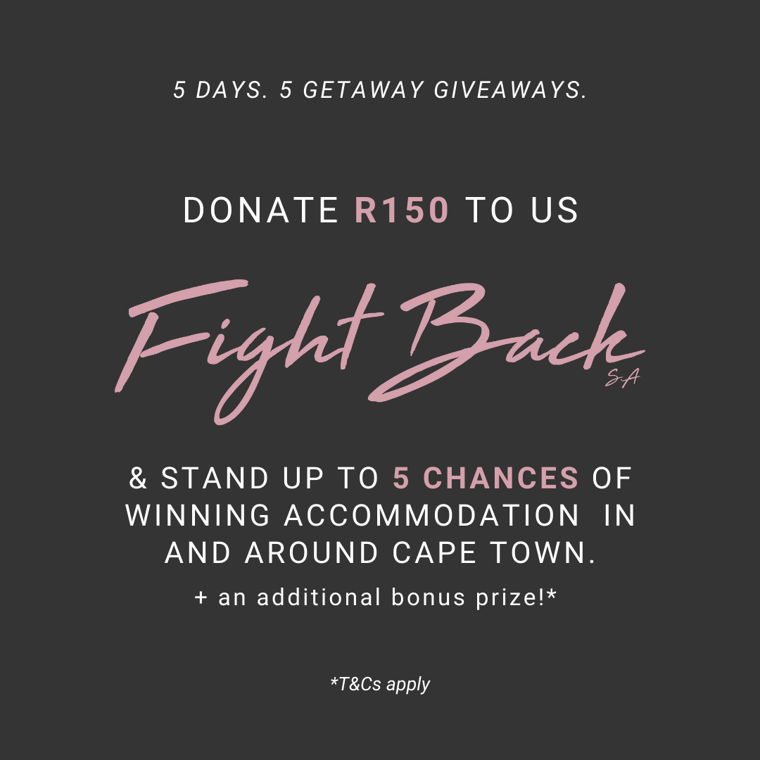 - Donate a minimum of R150 via this Quicket page to Fight Back SA. A R150 donation = 1 entry into all 5 getaway giveaways + the bonus prize (provided you enter before the Getaway Giveaway Week begins). A R300 donation = doubles your chances, etc.