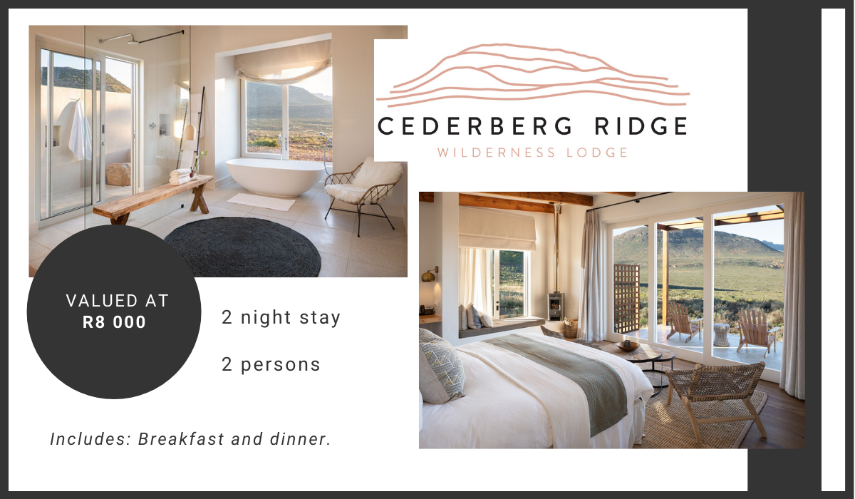 - One donation of R150 enters you into all 5 days (6 prizes) of our Getaway Giveaway Week* provided you enter before any winners begin being announced. If you win one of the prizes? Your name will still be entered into the remaining draws.