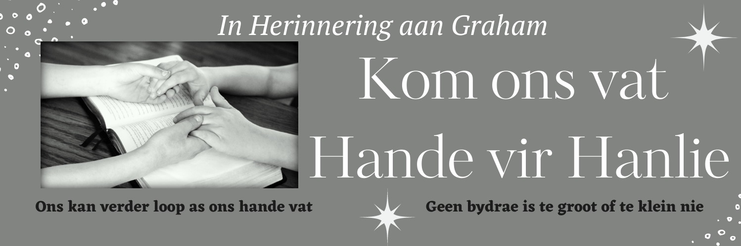 In 2016 is Graham met breinkanker gediagnoseer, en deur die Here se genade het die gewas gekrimp. Elke jaar het hy vir toetse gegaan, maar hierdie jaar (2022) was die uitslae baie sleg. Daar was twee kwaadaardige gewasse in sy brein en die dokters kon niks meer vir hom doen nie. Graham het geweldig vinnig agteruitgegaan. Ons het egter aanhou glo, maar die Here het hom onverwags kom haal, agt dae voor sy 42ste verjaarsdag. Hy laat sy vrou en twee jong kinders agter. Ook sy ma, Hanlie, wat van sy finansiële ondersteuning afhanklik is.