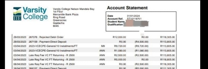 Attached, please find a copy of my account statement from Varsity College for your consideration.