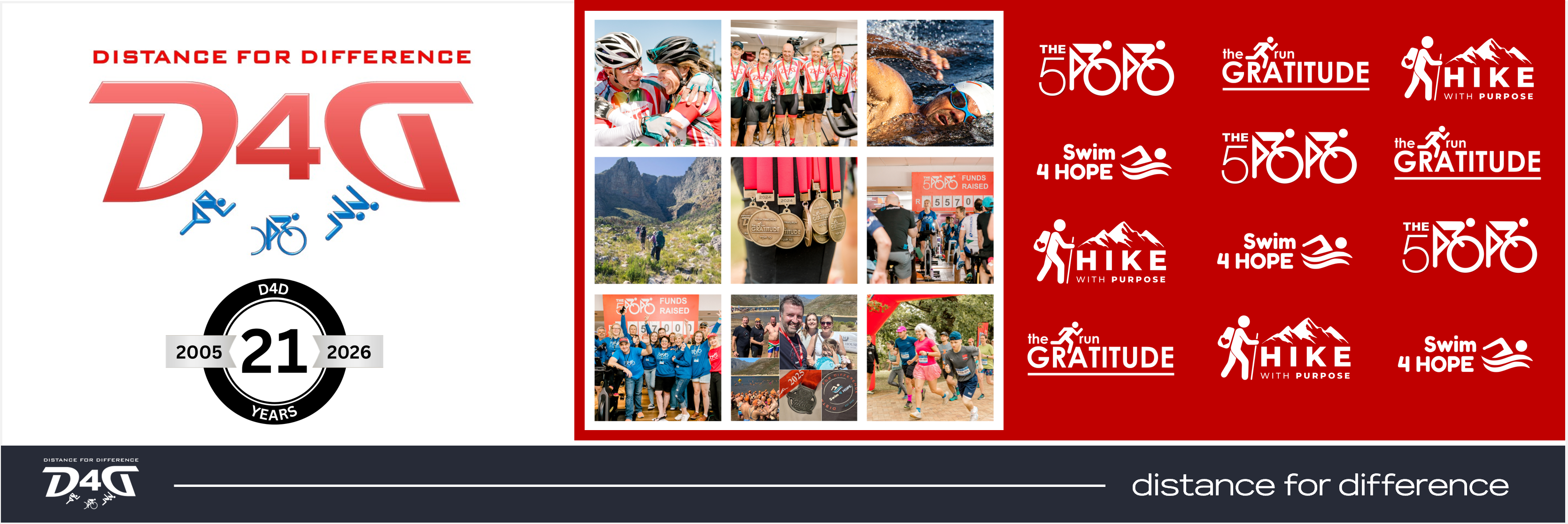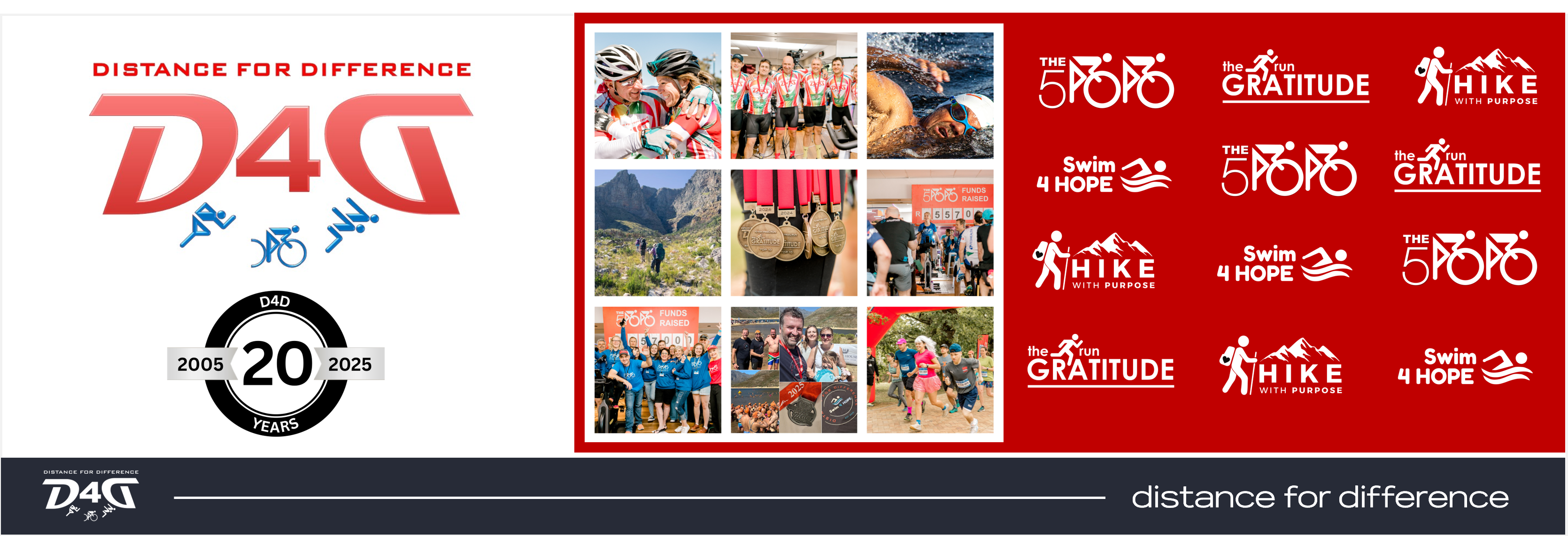 Distance For Difference (D4D), is a registered non-profit organisation which, since 2005, made a significant impact in the wellbeing of children in South Africa. D4D use sport to generate funds for distribution to various children's charities. This is done through individual athletes who find sponsors for every km they run, cycle or swim during a year, while training or participating in specific events, e.g. the Comrades Marathon, the Absa Cape Epic, IRONMAN, The Cape Town Cycle Tour, etc. Secondly, D4D hosts two fundraising events – The GRATITUDE Run (an annual event) and THE500 24hr-Cycling-and-Spinning-Challenge, which is held every second year. We also launched the Swim 4 HOPE and HIKE with Purpose fundraising brands in 2023 and 2025 respectively. Over the past twenty-one years, D4D raised and distributed more than R14 million. Some of our beneficiaries include Patch Helderberg, Kingdom Kids, Little Angels, Sylvia's House, Tzadokah Foster Home, Esther van Zyl, Gabriella Centre, Heartlands Baby Sanctuary, Kin Culture, just to name a few.