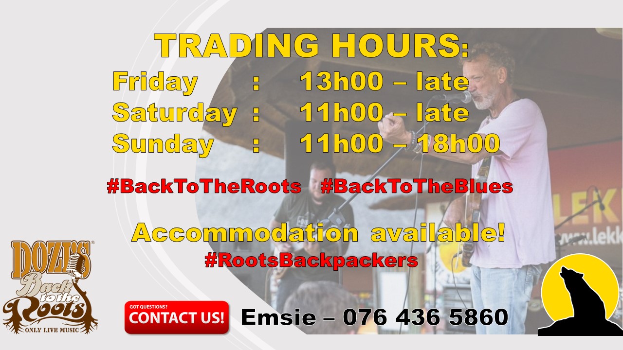Back to the Roots (buitelug) en Back to the Blues (binnenshuis) is oop Vrydae, Saterdae én Sondae!