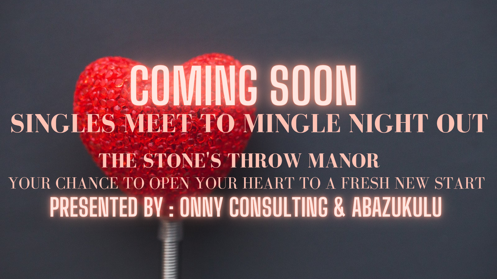 Life is complete with the colour of love and where you find it is a place to forever treasure... Onny consulting and Abazukulu are excited to invite you to a Singles Meet to Mingle Night Out where you get to meet new people with the same agenda as you. The aim is to create beautiful memories leading to the beginning of a fresh new start. During your time with us, you get to enjoy exotic fun games getting you closer to the one that catches your eye, nibble on our exquisite tastes and also a Bartender will be at your service in our cash bar. Due to Covid-19 rules & regulations, only 30 guests are to attend the event & if you worried about driving home late or wondering if you can spend the night with THE ONE, do not because The Stone's Throw Manor has room for accommodation yet they are to be shared by the one's who have made the booking for a sleep in, contact us after your ticket purchase for more details. Theme up to a confident outfit with a splash of RED wherever you want it. Look your absolute best you will be around singles, you may just never know. Come join us for the night to remember... This is your chance to open your heart to a fresh new start.