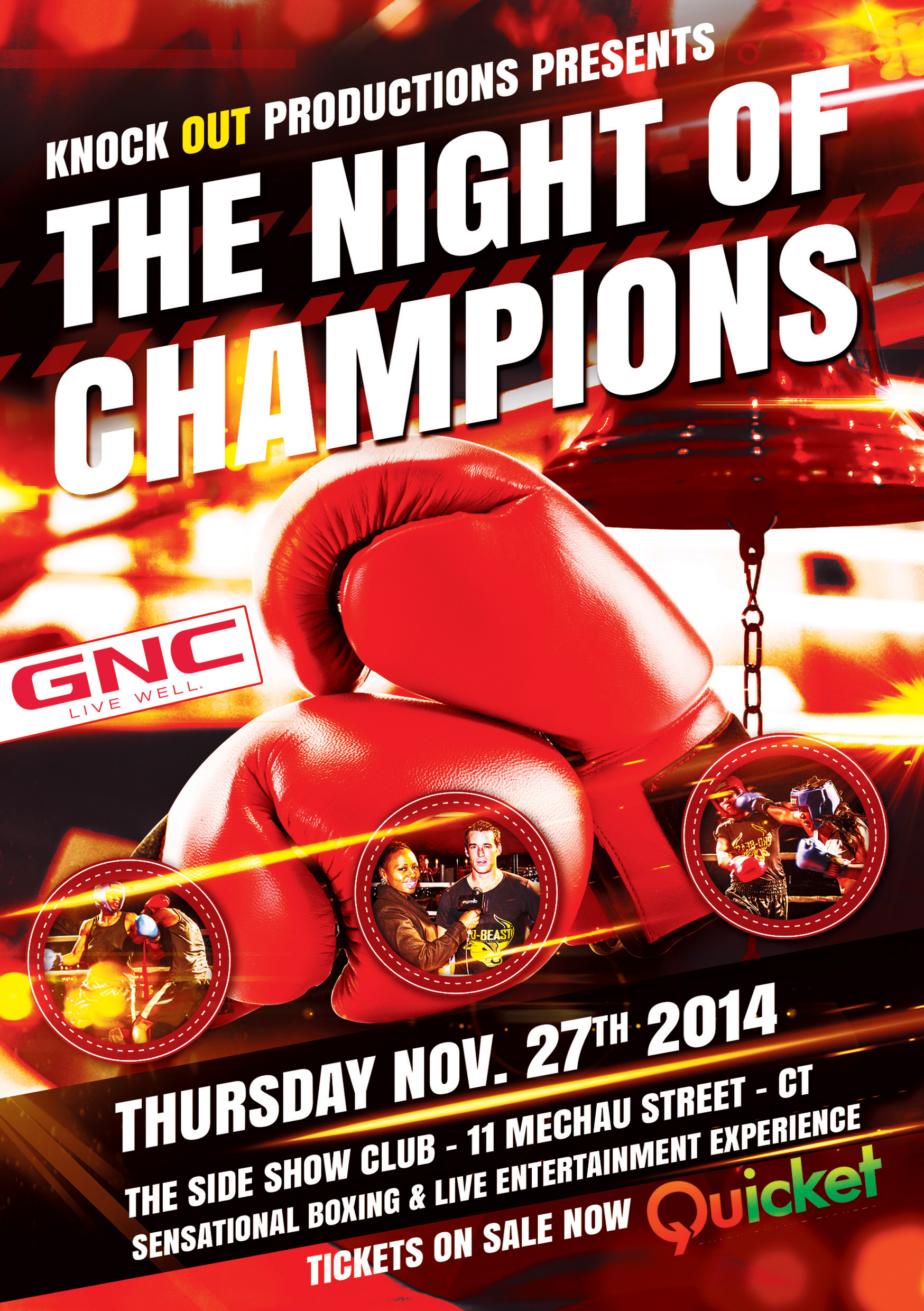 Night of Champions is a boxing extravaganza created as a platform for celebrities and amateur boxers , men and women from all walks of life to showcase their skills .This amazing spectacle brought to you by GNC is enteratainment filled ,with special guest and loads of extravagant entertaining inserts in between matches.The main feature being a series of celebrity boxing matches.