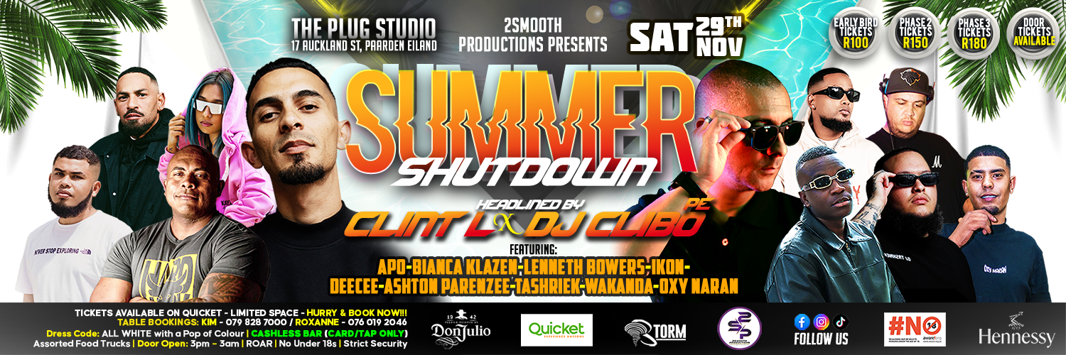 Summer Days, Blues Skies, Great Food and Music what more could we ask for?? The SUMMER SHUTDOWN takes places on the Last Saturday of November @ The Plug Studios Paarden Eiland Featuring Headliners Clint L x DJ Clibo (PE)