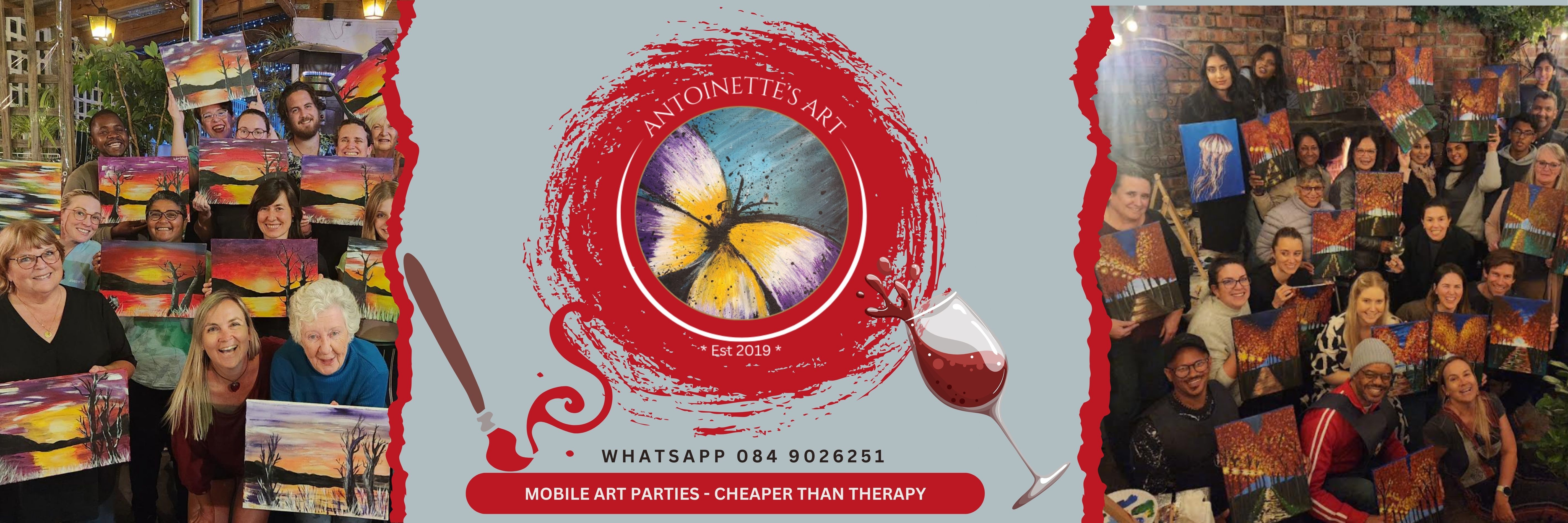 Antoinette's Art offers mobile art workshops across Cape Town. No experience required. From private art parties to team builders and year end functions. We bring the art to you. We make it easy for everyone to enjoy the creative process and create something beautiful. By following the step-by-step instructions everyone will have an opportunity to bring out their inner Picasso. We offer acrylic on canvas and provide everything that is needed to make your event super fun. definitely CHEAPER THAN THERAPY!