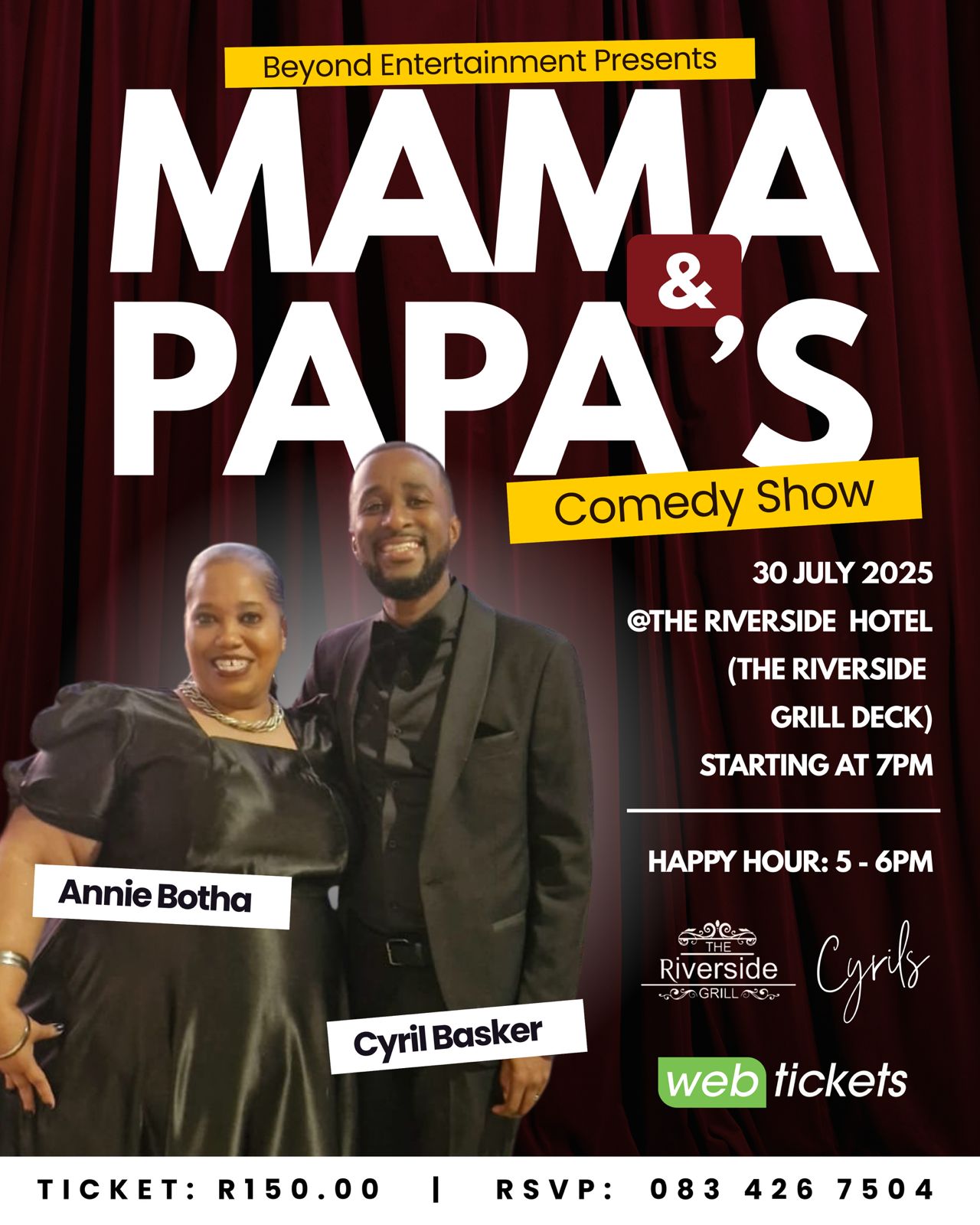 South African's need laughter and we bringing it to Durban's Riverside Hotel on the 30th of July, a brand new show called Mama's & Papa's brought to you by Beyond Entertainment featuring Cyril Basker & Annie Botha. The show is no swearing and suitable for the whole family (PG13).