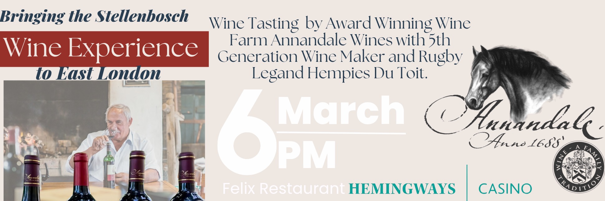 This special evening features Annandale Wines, a historic estate renowned for its exceptional red wines, and is graced by the presence of rugby legend and fifth-generation winemaker, Hempies du Toit.