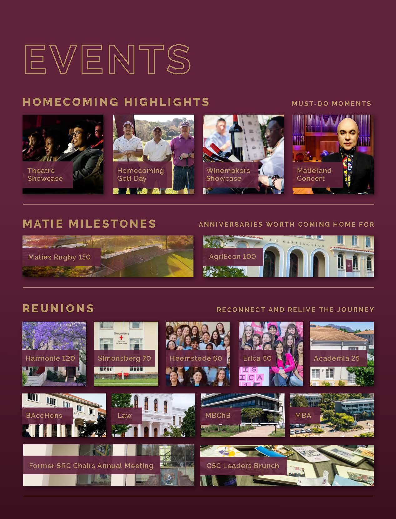 Twenty twenty-five will be a special Homecoming, from significant reunion events which include 150 years of Maties rugby, Simonsberg 70, Academia 25, Harmonie 120, Heemstede 60 and Erica 50 to our annual Matie Winemaker Showcase focusing on 100 Years of Pinotage in 2025. We also bring back the LLB, MBCHB, BAcc, MBA classes as well as specially invite all 1st years from 2015, 2005, 1995, and 1985.
