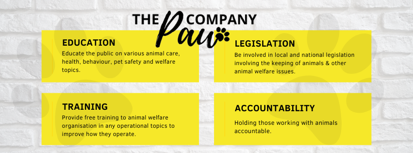 THE PAW COMPANY (NPC 2019 / 400272 / 08) is a non-profit company in SA founded in 2019. Its purpose is to provide complimentary business guidance to animal welfare organisations, educate the public, and help change animal welfare legislation.