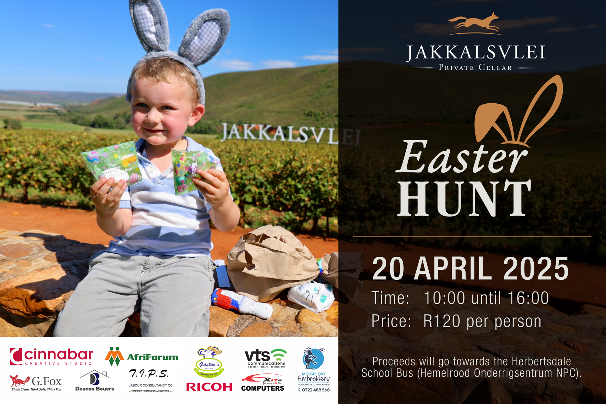 The event will be on 20 April 2025 from 10:00 to 16:00 at the Jakkalsvlei Wijnhuis restaurant. Each entrant will receive a pair of bunny ears before entering the vineyard block to go in search of Jakkalsvlei corks, each entrant needs to find 5 corks to claim their Easter parcel. The parcel includes treats and activities for the kids.