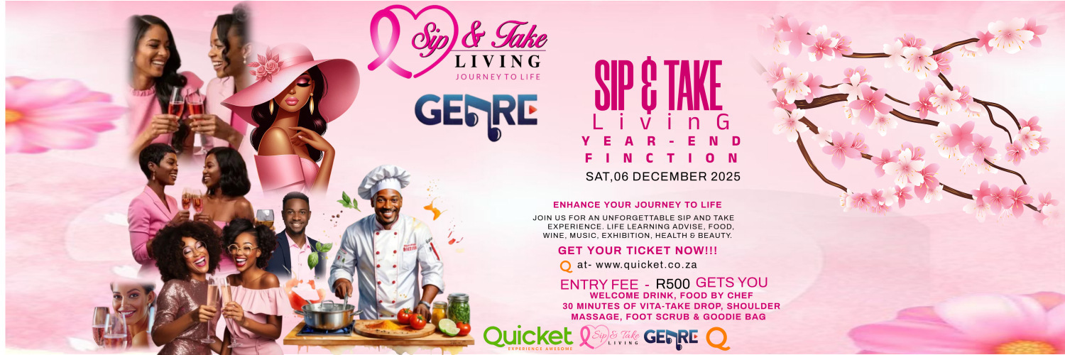 "COME CELEBRATE THE END OF YEAR WITH US" JOIN US FOR AN UNFORGETTABLE SIP AND TAKE EXPERIENCE. LIFE LEARNING ACTIVITES, FOOD, WINE, MUSIC, HEALTH & BEAUTY. AT GENRE ARCADIA 497 PRETORUIS STR NDLALA MALL, ARCADIA, PRETORIA 0001