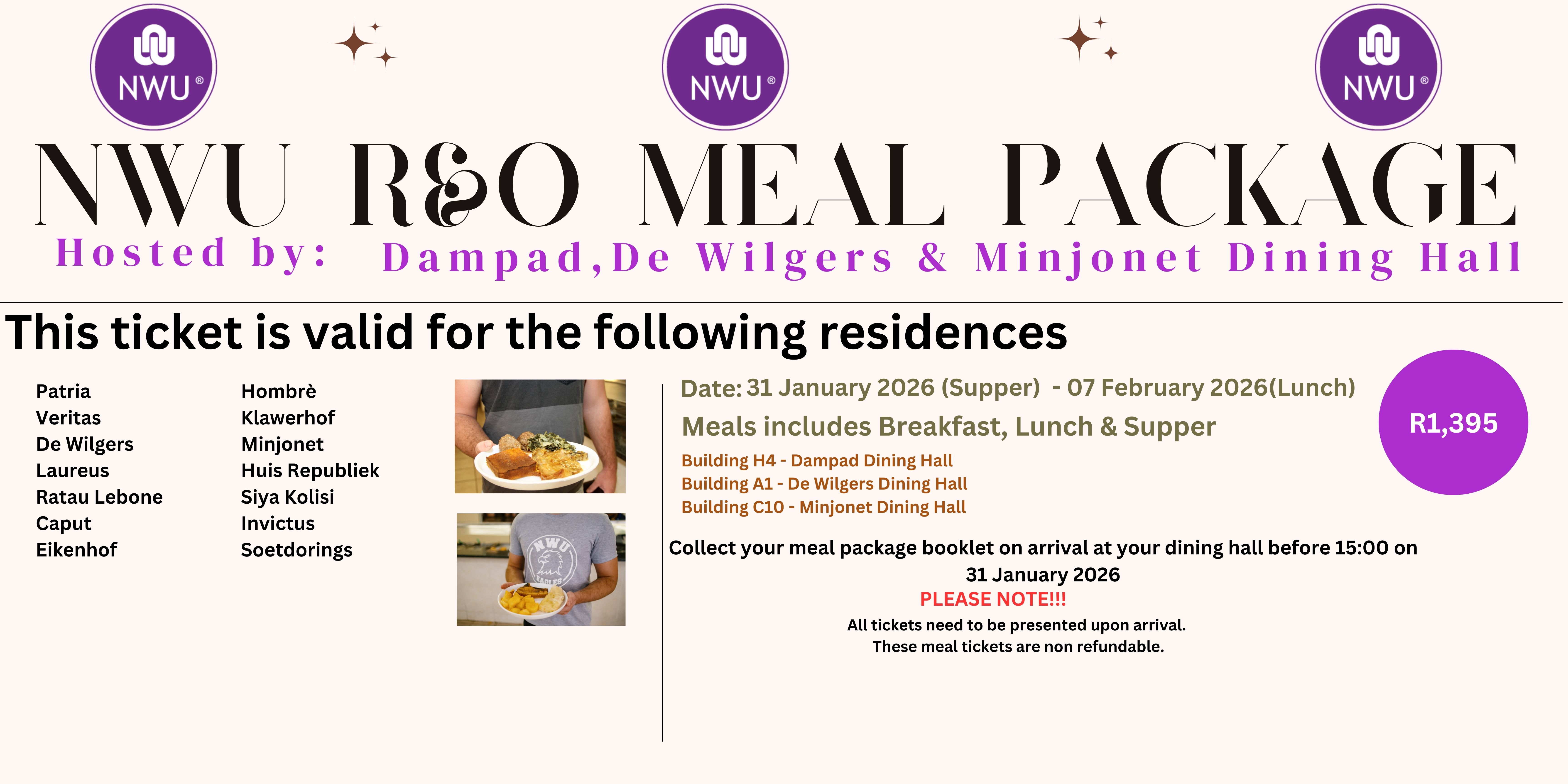 The R&O Meal Package must be purchased from Quicket in advance from 19 January 2026 to 31 January 2026. Link: https://services.nwu.ac.za/business-and-enterprise-development/catering-services#ro Provide your Quicket QR barcode before 15:00 on 31 January 2026 at your dining hall to claim your meal ticket booklet.