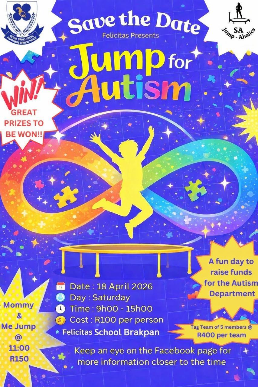 Join us on Saturday, 18 April 2026 from 09:00–15:00 for Jump 4 Autism, a high-energy rebounding fun day in partnership with Jump-Aholics SA. This community event brings together families, learners, parents, and local businesses to raise awareness and celebrate autism in a joyful, inclusive space.