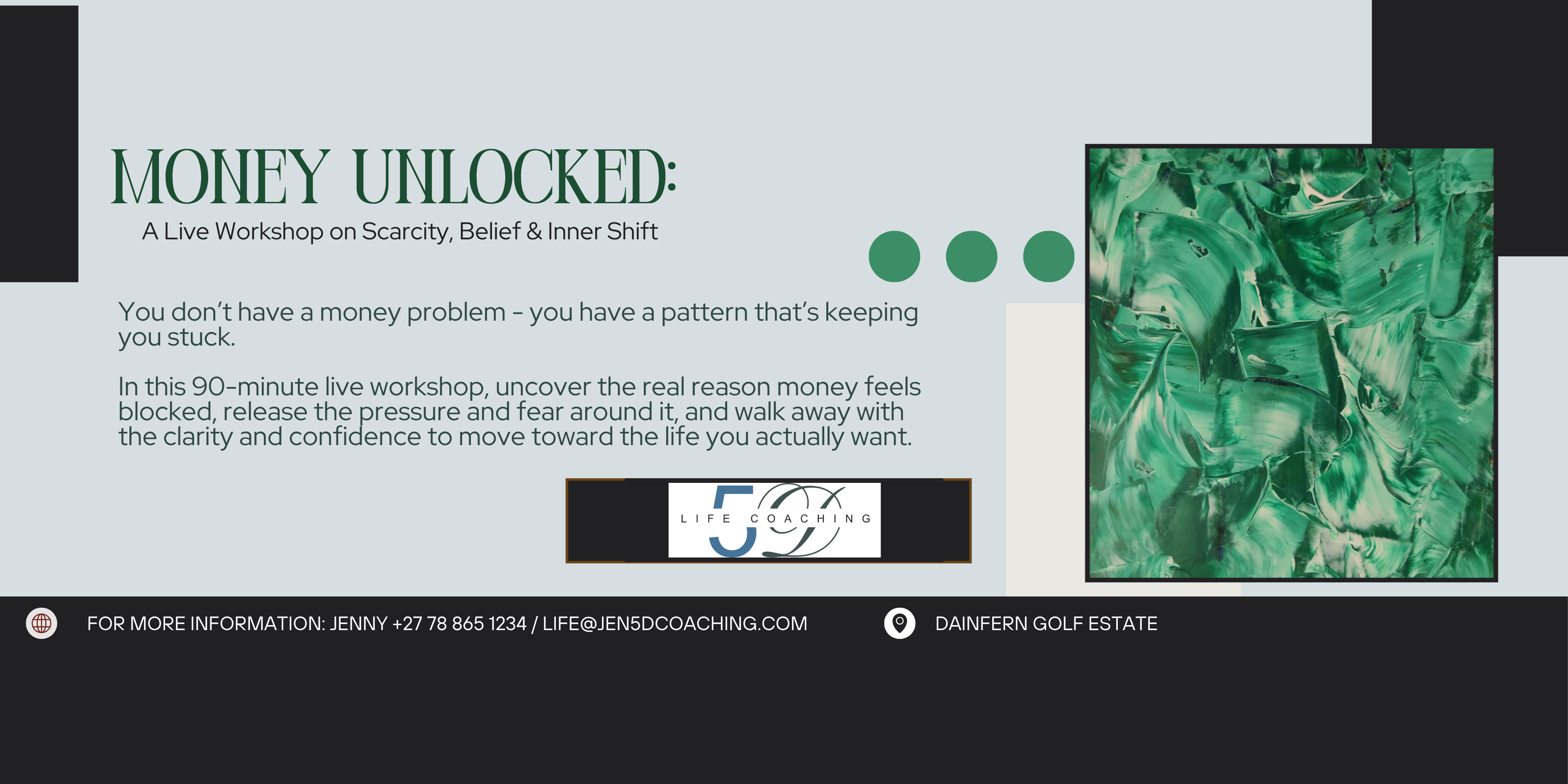 In this 90-minute workshop, uncover the real reason money feels blocked, release the pressure and fear around it, and walk away with the clarity and confidence to move toward the life you actually want.